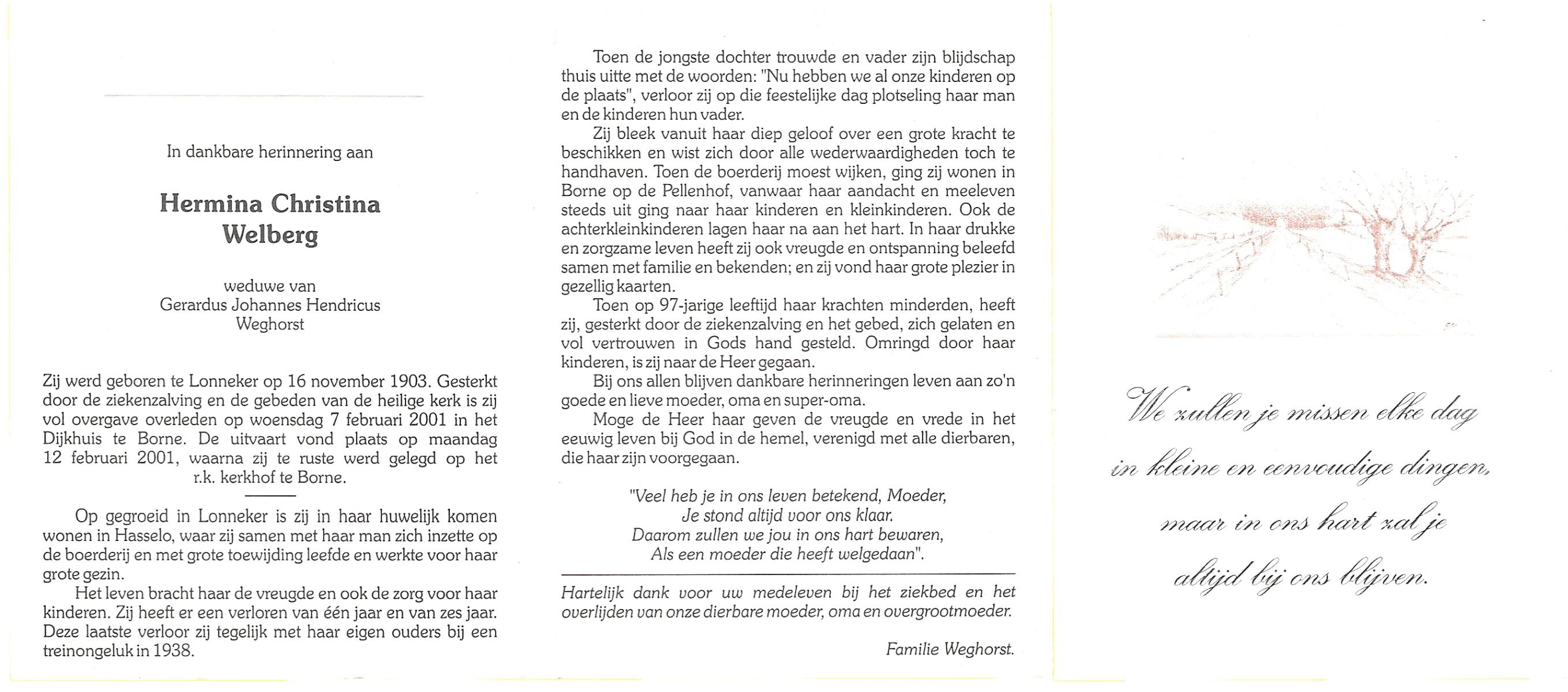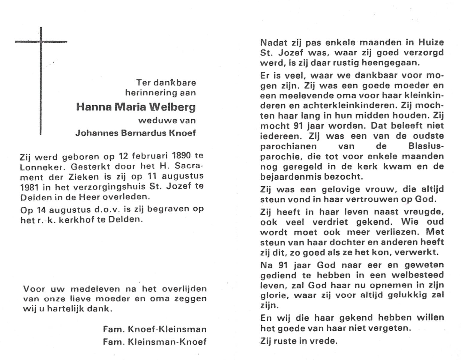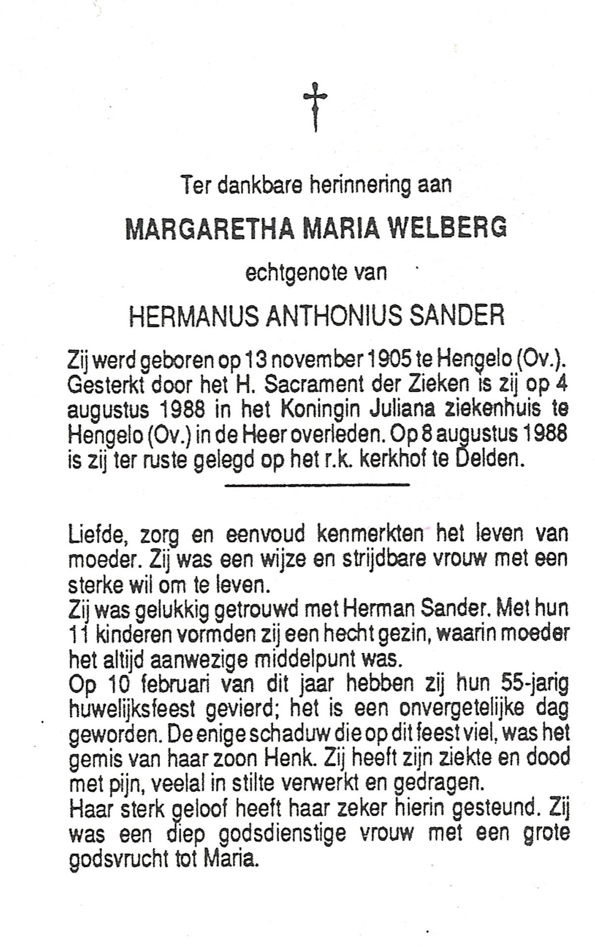 WELBERG, Margaretha Maria, geboren op 13-11-1905 te Hengelo (O), overleden op 4-8-1988 te Hengelo (Ov.) op 82-jarige leeftijd, begraven op 8-8-1988 te Delden.