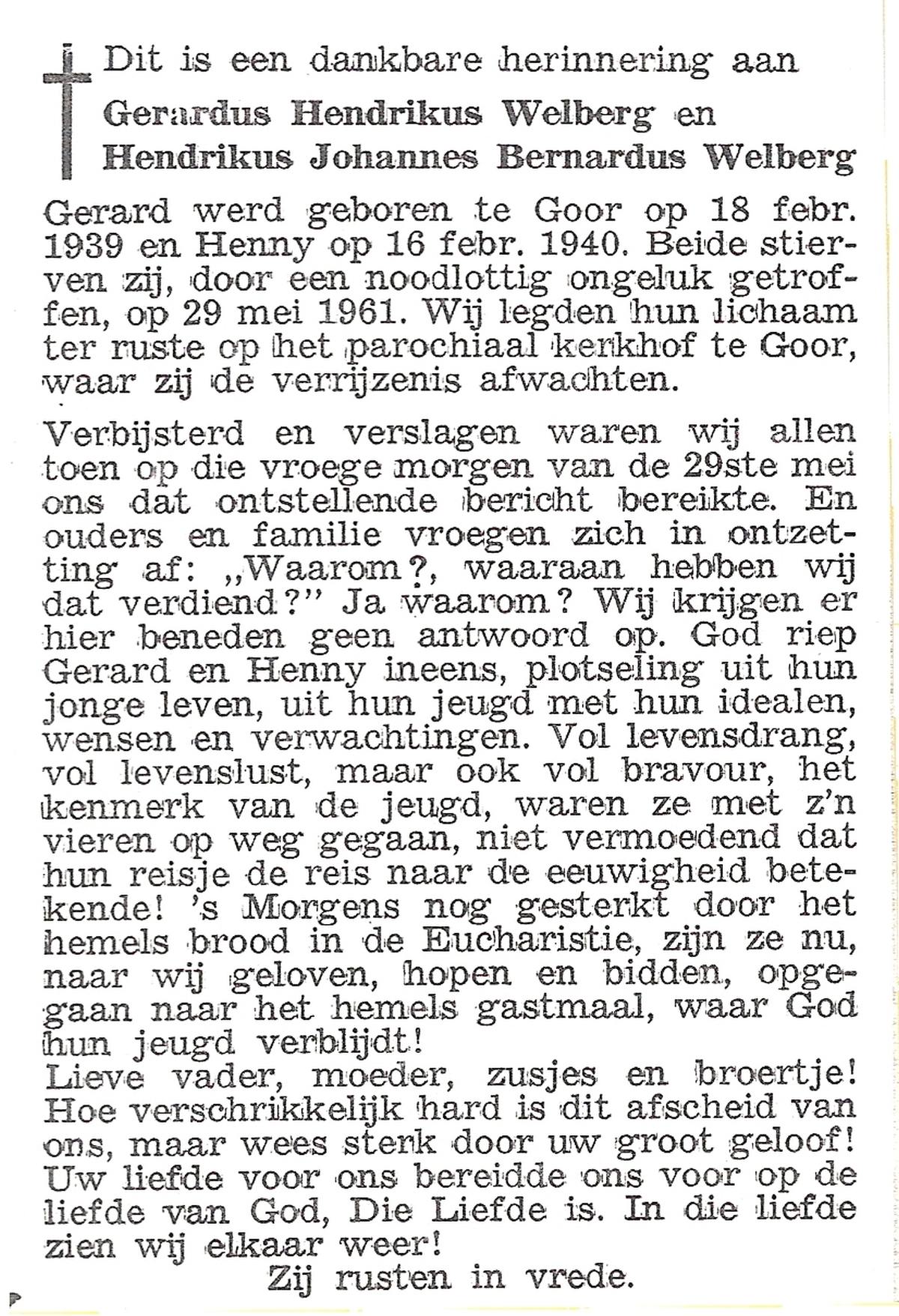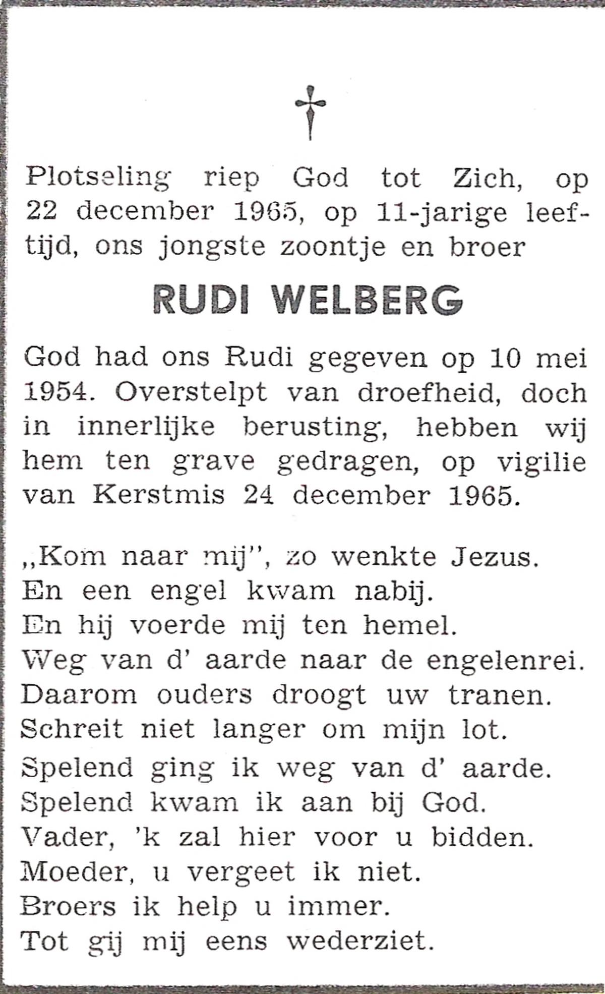 WELBERG, Rudi, geboren op 10-5-1954, overleden op 22-12-1965 op 11-jarige leeftijd, begraven op 24-12-1965.