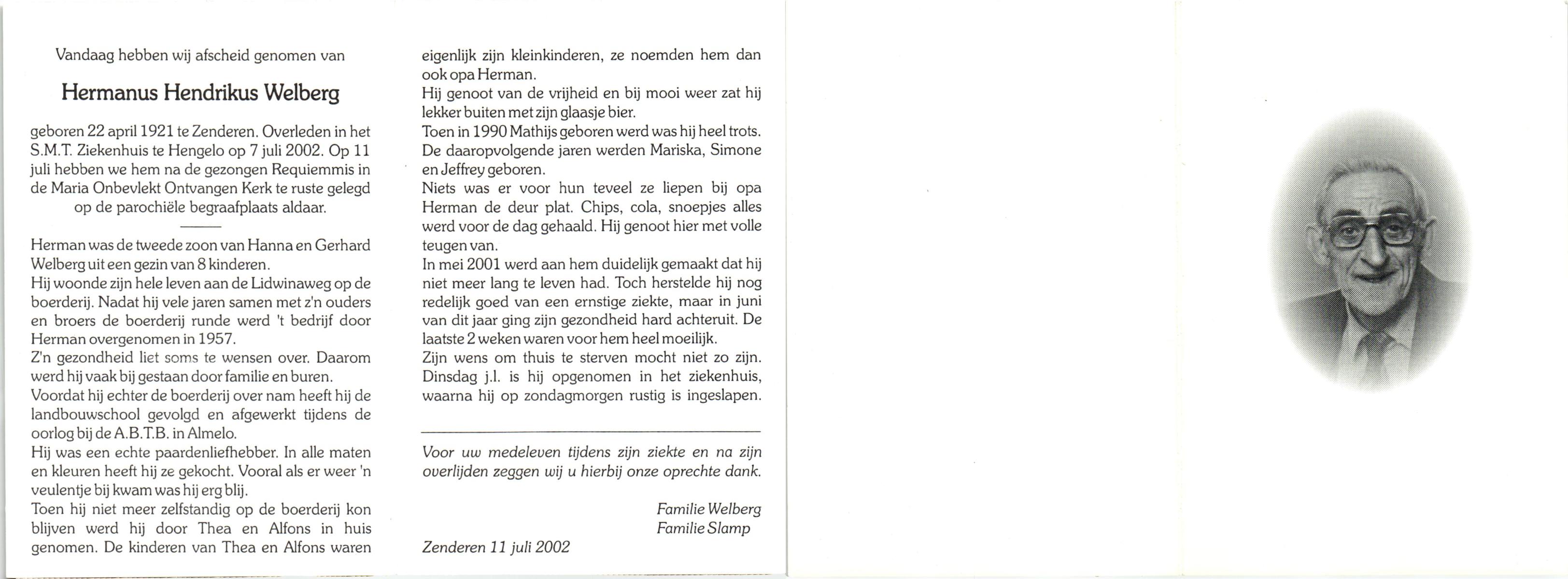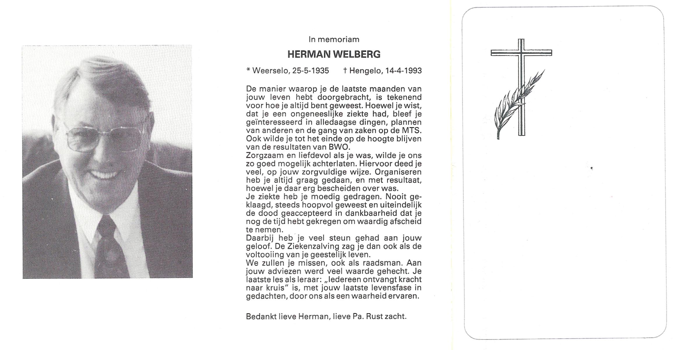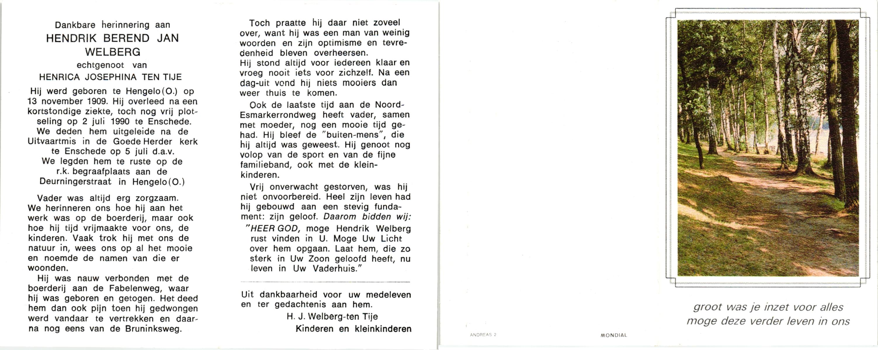 WELBERG, , Hendrik Berend Jan, geboren op 13-11-1909 te Hengelo (O), overleden op 2-7-1990 te Enschede op 80-jarige leeftijd, begraven op 5-7-1990 te Enschede.