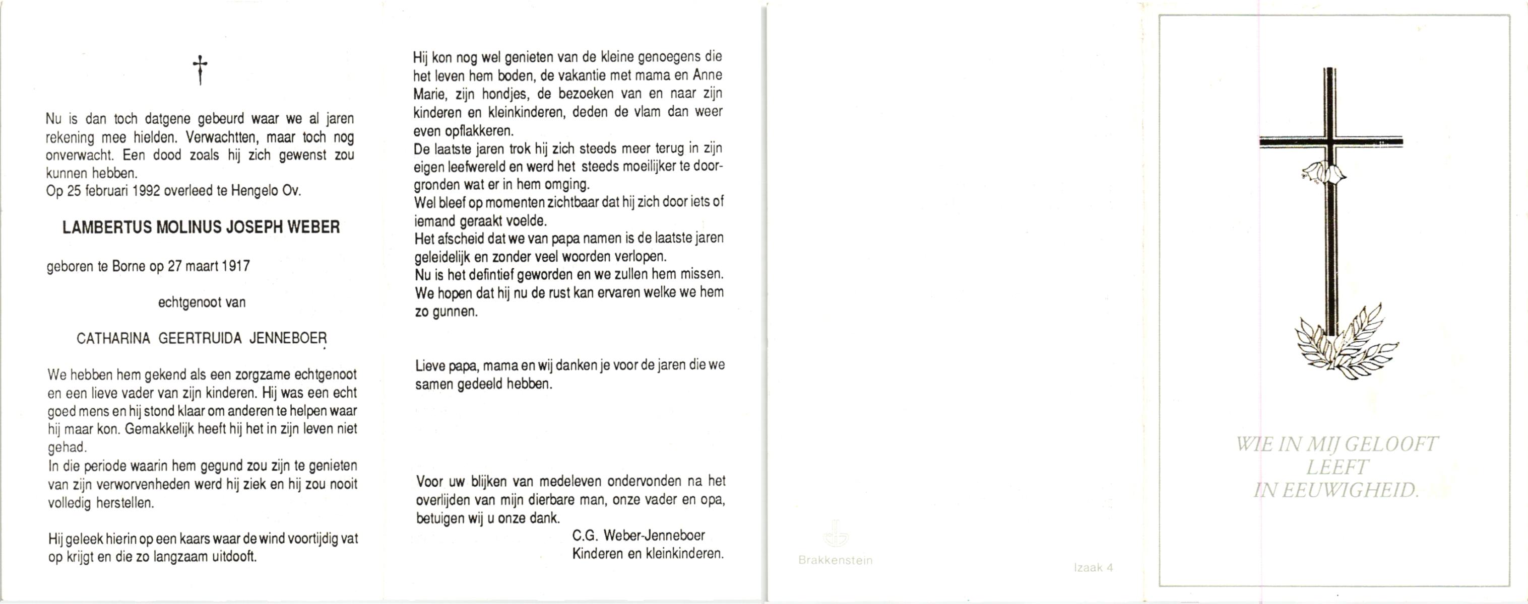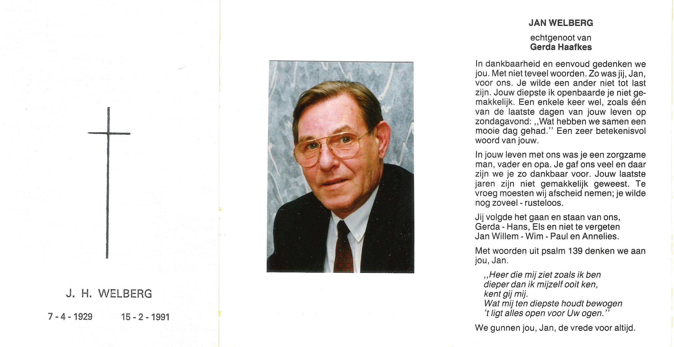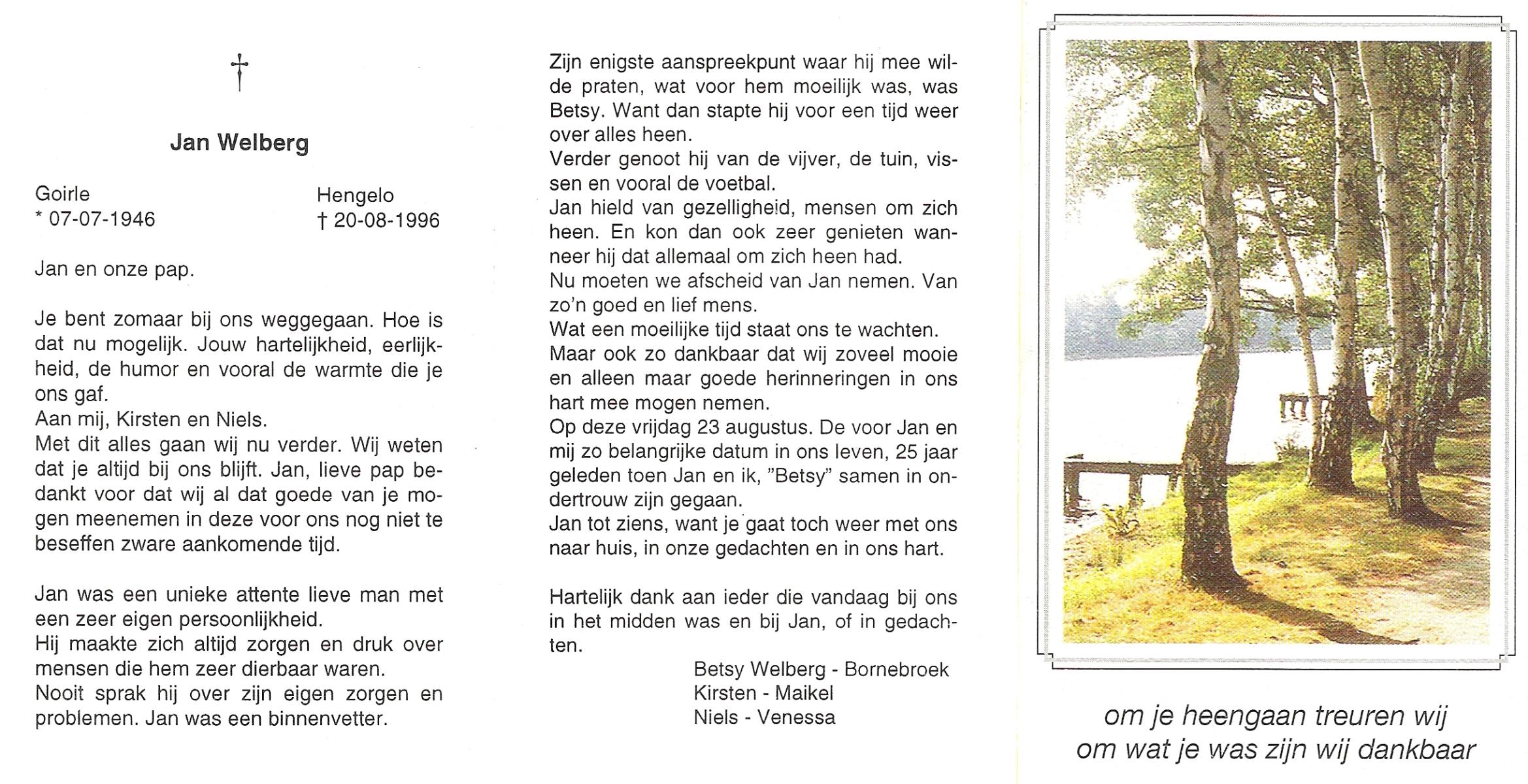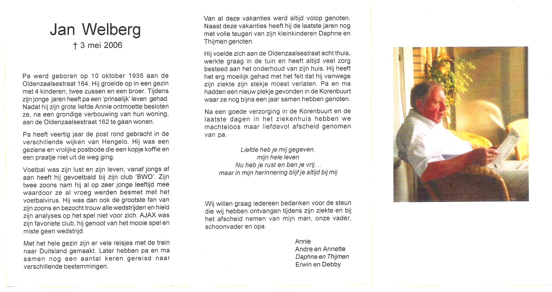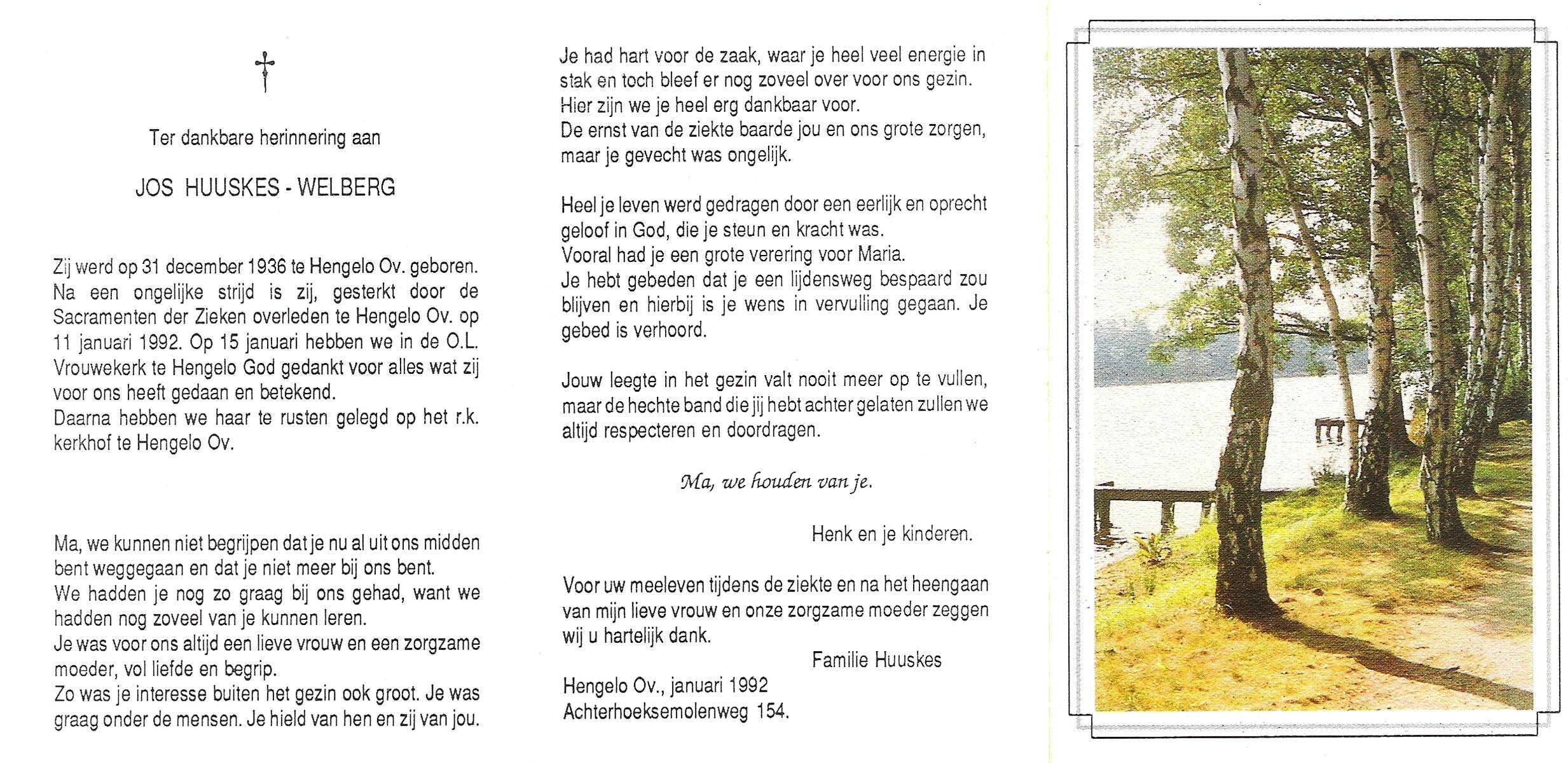 WELBERG, Jos, geboren op 31-12-1936 te Hengelo (O), overleden op 11-1-1992 te Hengelo (Ov.) op 55-jarige leeftijd, begraven op 15-1-1992 te Hengelo (Ov.).