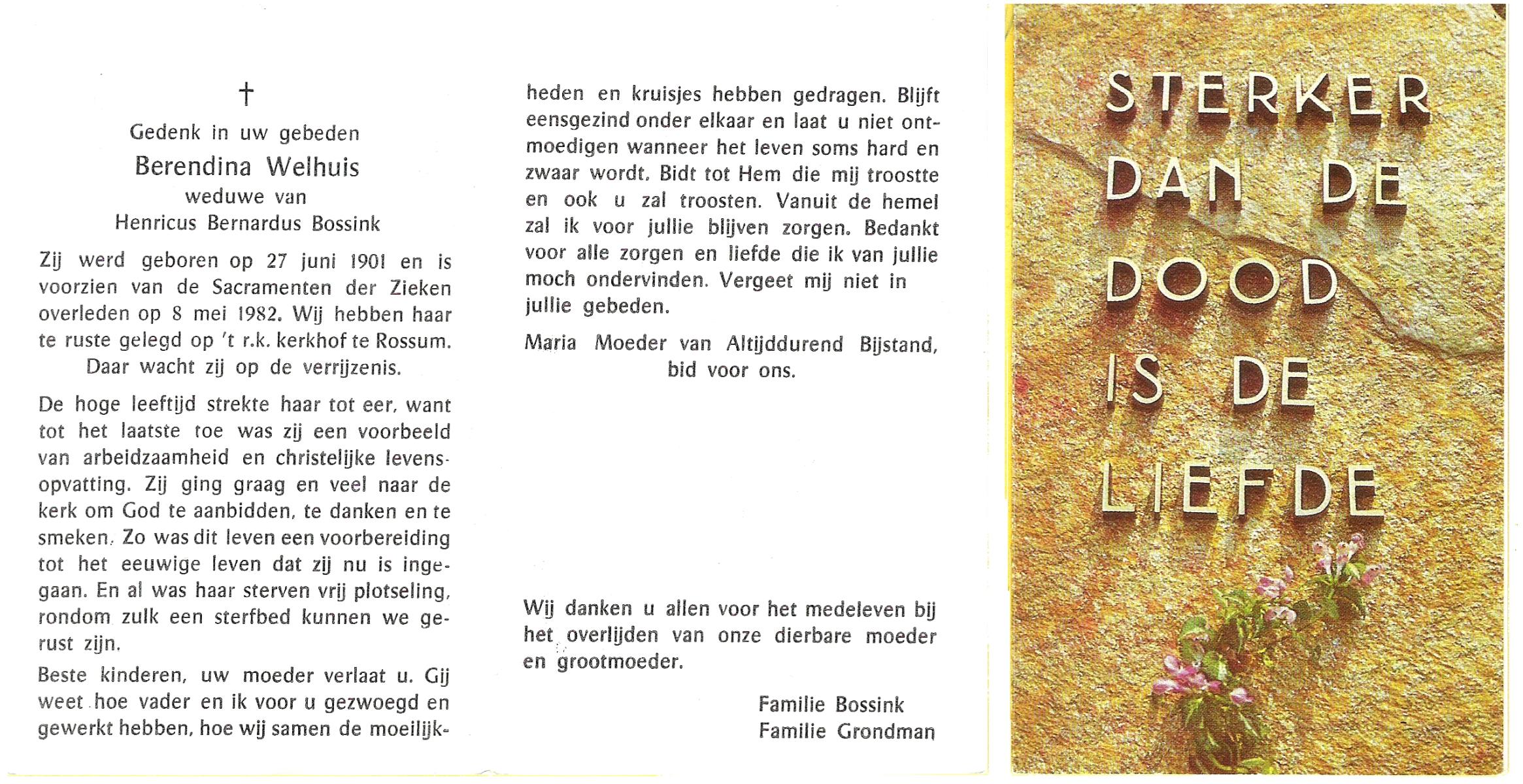 WELHUIS, Berendina, geboren op 27-6-1901, overleden op 8-5-1982 op 80-jarige leeftijd, begraven te Rossum.