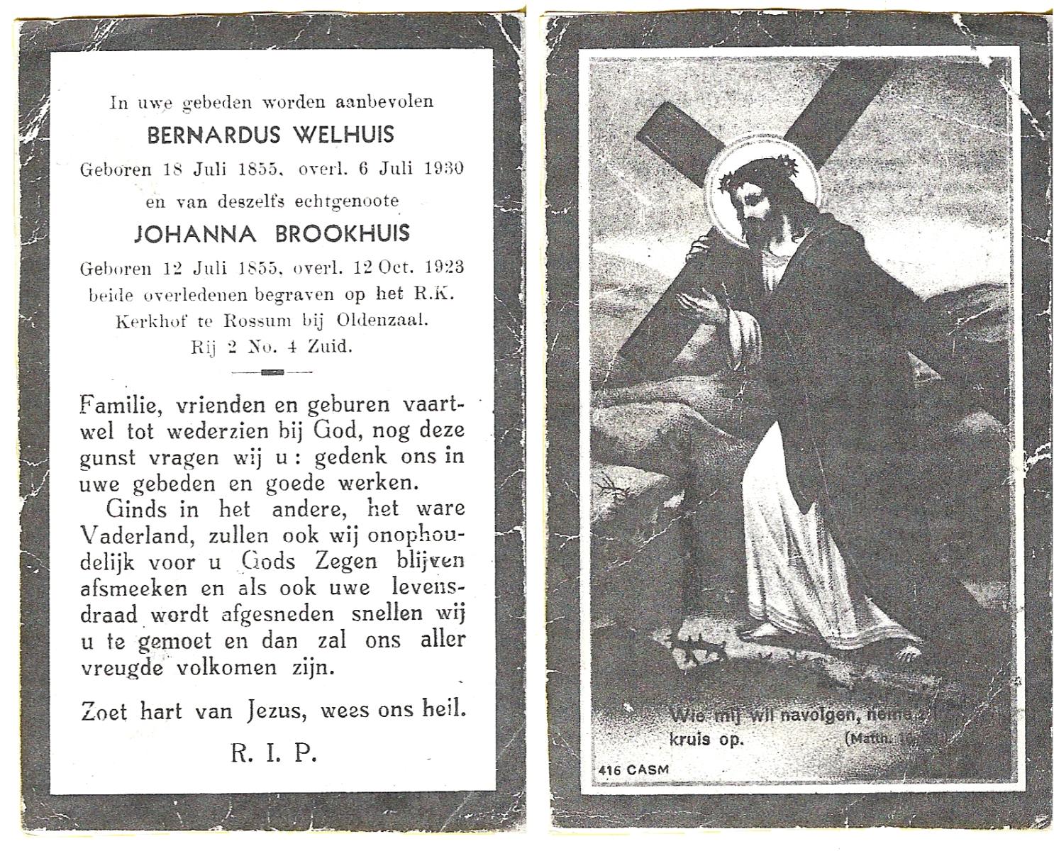 WELHUIS, Bernardus, geboren op 18-07-1855, overleden op 6-7-1930 op 74-jarige leeftijd, begraven op 00-07-1930 te Rossum r.k.kerkhof Rij 2 nr.4 zuid.