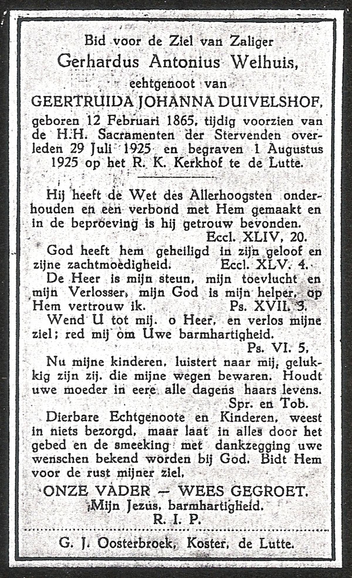 WELHUIS, Gerhardus Antonius, geboren op 12-02-1865, overleden op 29-7-1925 op 60-jarige leeftijd, begraven op 1-8-1925 te De Lutte.
