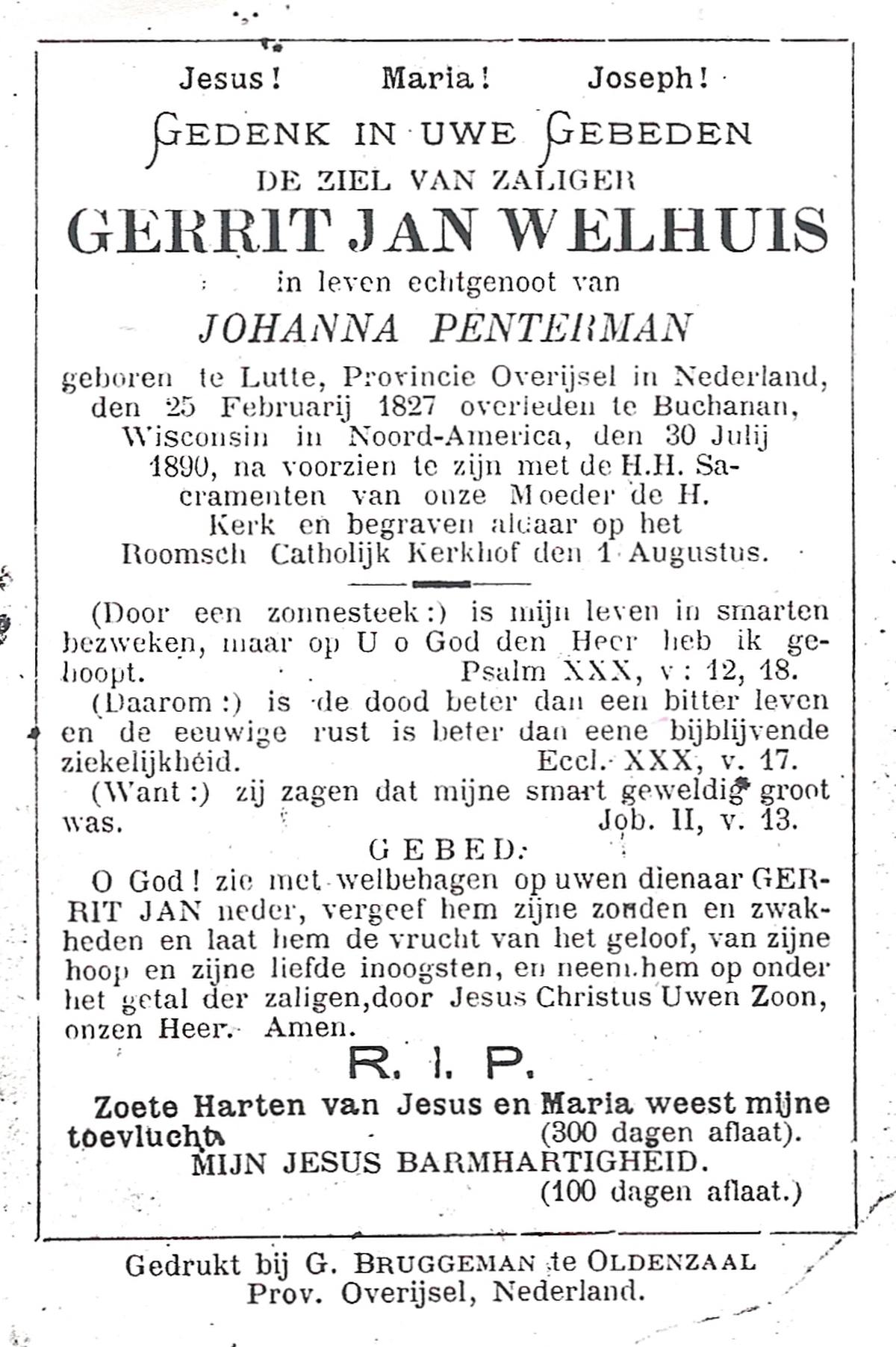 WELHUIS, Gerrit Jan, geboren op 25-02-1827 te De Lutte, overleden op 30-07-1890 te Buchanan(VS) op 63-jarige leeftijd, begraven op 01-08-1890 te Buchanan(VS).