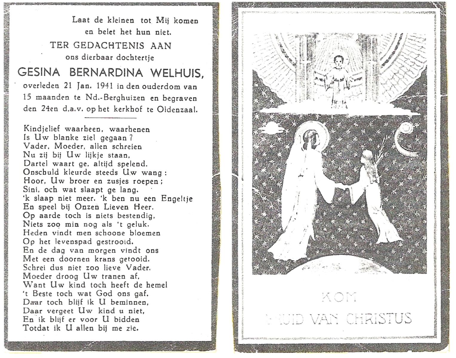 WELHUIS, Gesina Bernardina, overleden op 21-1-1941 te Nd.Berghuizen op 1-jarige leeftijd, begraven op 24-1-1941 te Oldenzaal.