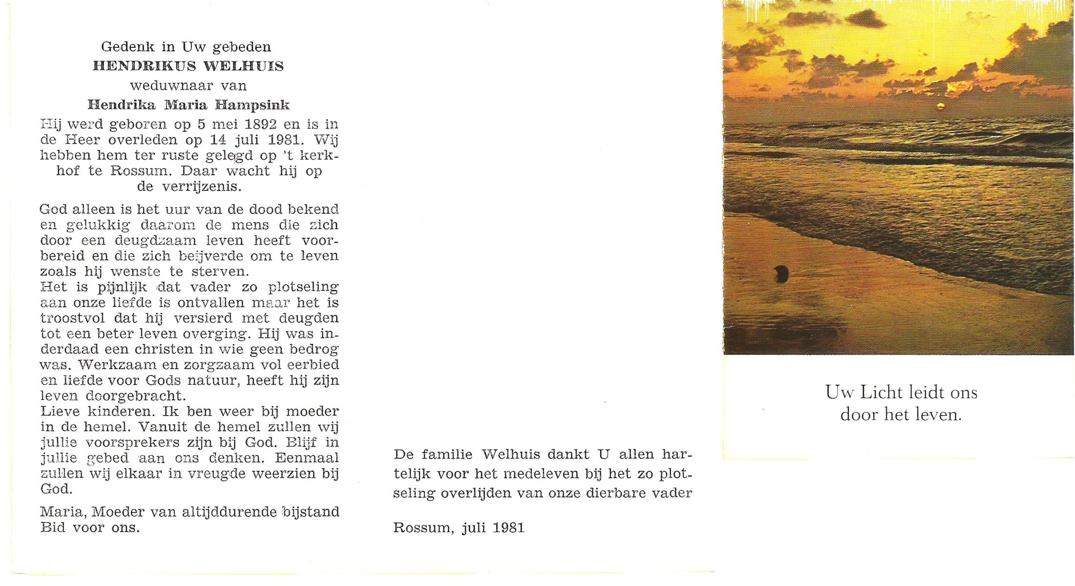 WELHUIS, Hendrikus, geboren op 05-05-1892, overleden op 14-7-1981 op 89-jarige leeftijd, begraven te Rossum.