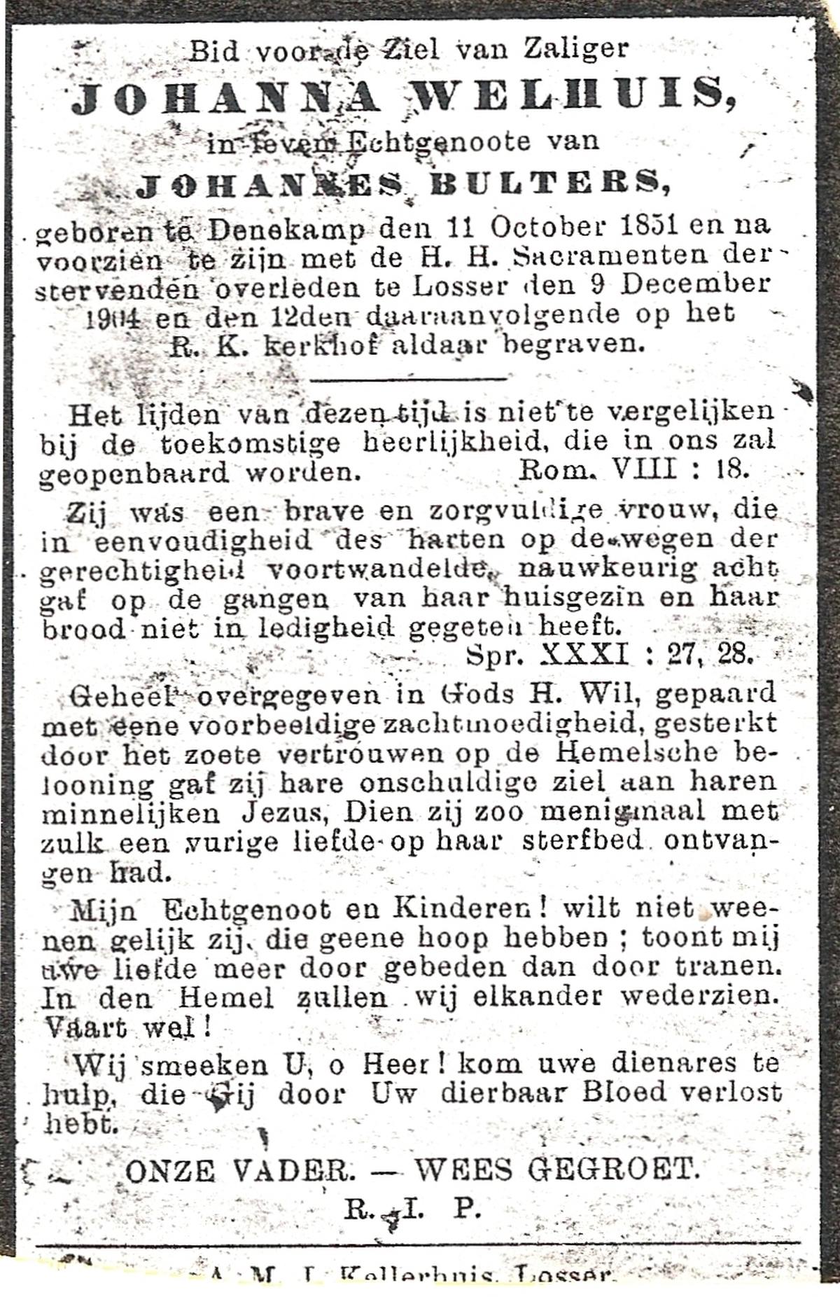 WELHUIS, Johanna, geboren op 11-10-1831 te Denekamp, overleden op 9-12-1904 te Losser op 73-jarige leeftijd, begraven op 12-12-1904 te Losser.