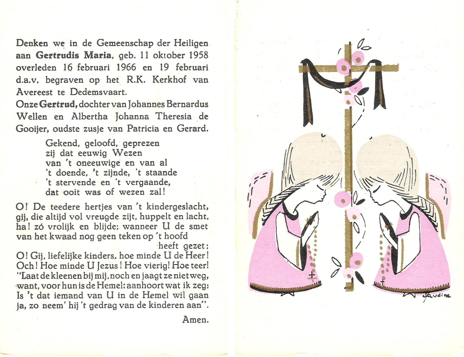 WELLEN, Gertrudis Maria, geboren op 11-10-1958, overleden op 16-2-1966 op 7-jarige leeftijd, begraven op 19-2-1966 te Avereest Dedemsvaart.