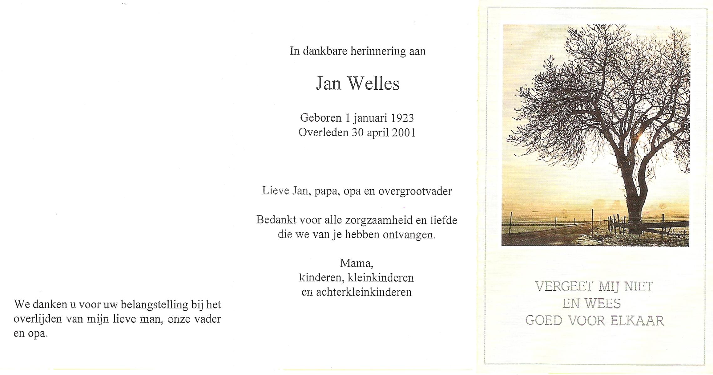 WELLES, Jan, geboren op 1-1-1923, overleden op 30-4-2001 op 78-jarige leeftijd.