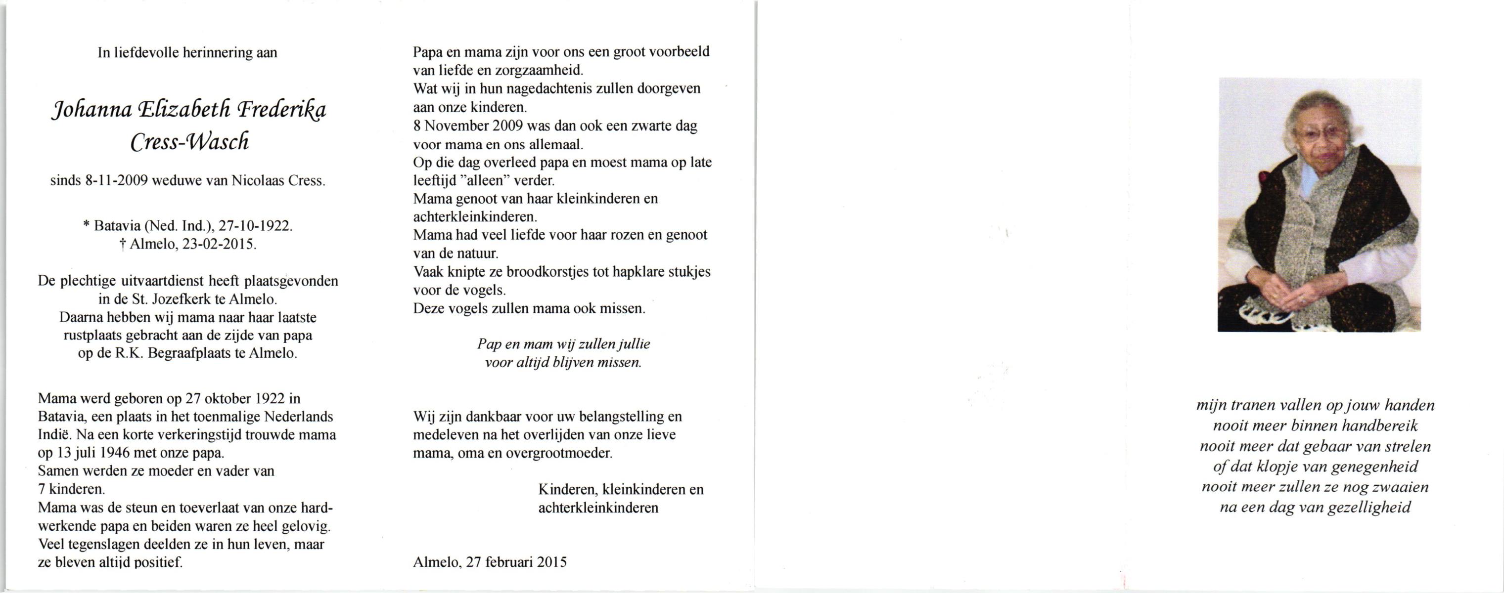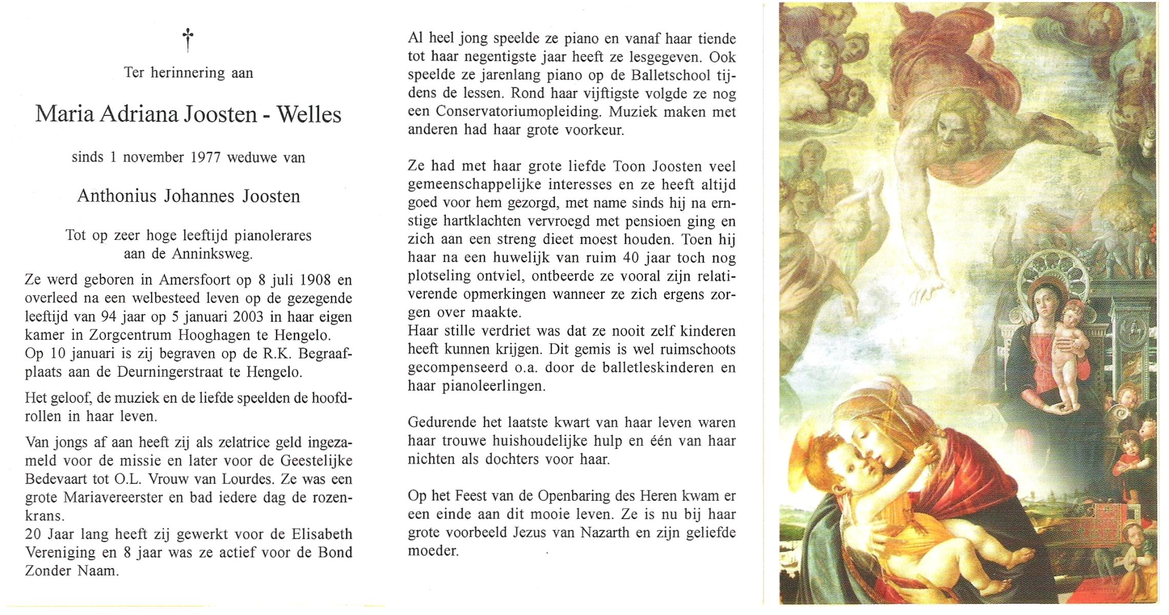 WELLES, Maria Adriana, geboren op 8-7-1908 te Amersfoort, overleden op 5-1-2003 te Hengelo (Ov.) op 94-jarige leeftijd, begraven op 10-1-2003 te Hengelo (Ov.).