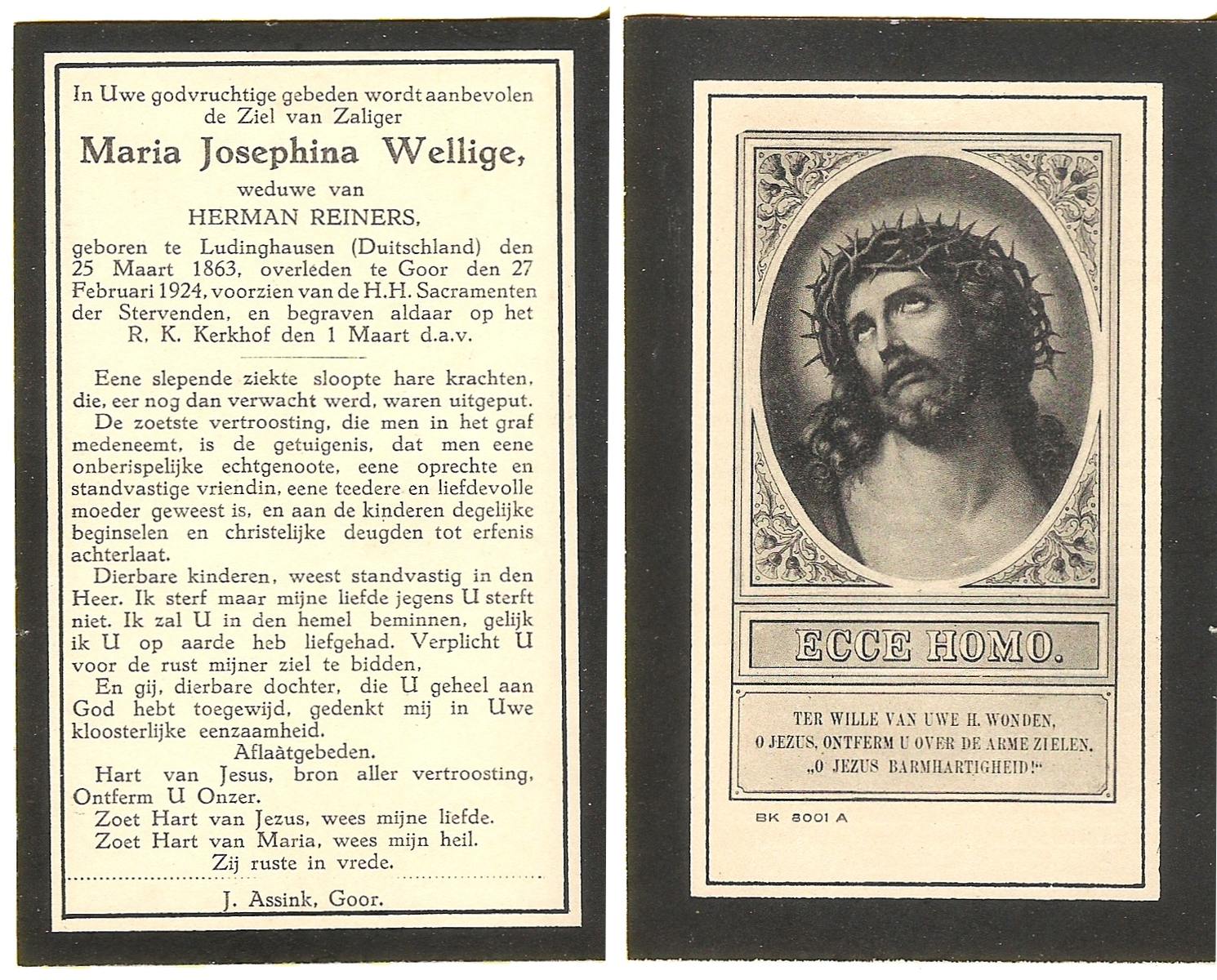WELLIGE, Maria Josephina, geboren op 25-03-1863 te Ludinghausen (Dld.), overleden op 27-2-1924 te Goor op 60-jarige leeftijd, begraven op 1-3-1924 te Goor.