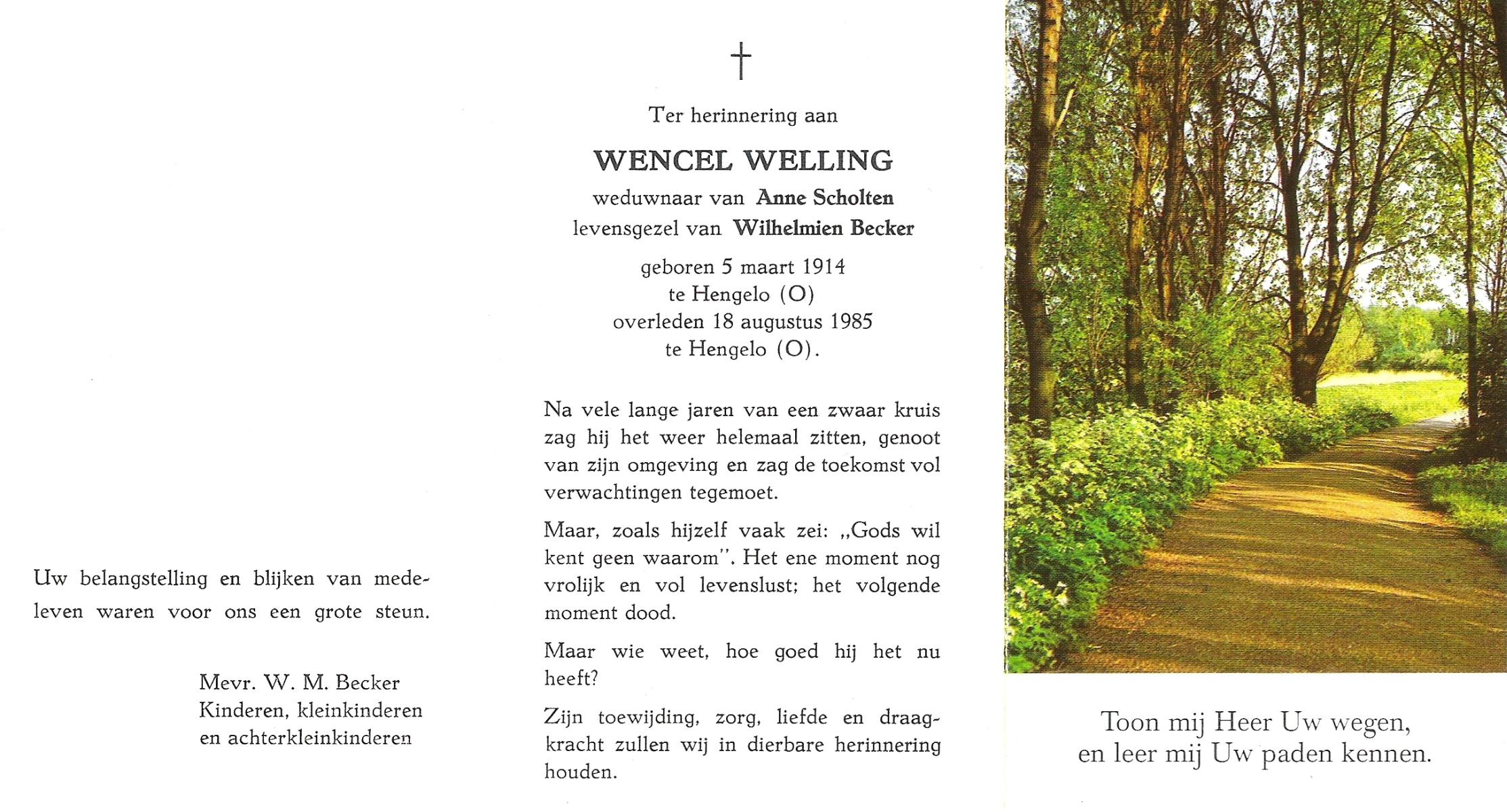 WELLING, Wencel, geboren op 5-3-1914 te Hengelo (O), overleden op 18-8-1985 te Hengelo (Ov.) op 71-jarige leeftijd.