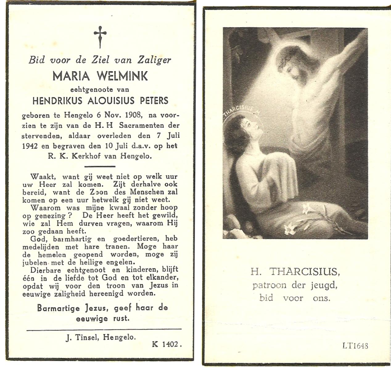 WELMINK, Maria, geboren op 6-11-1908 te Hengelo (O), overleden op 7-7-1942 te Hengelo (Ov.) op 33-jarige leeftijd, begraven op 10-7-1942 te Hengelo (Ov.).