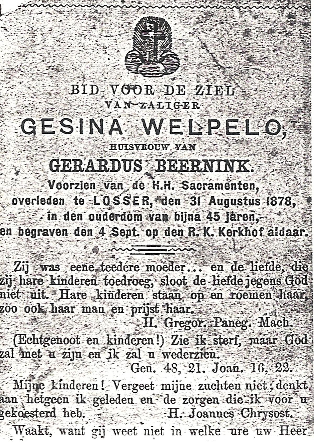 WELPELO, Gesina, overleden op 31-08-1878 te Losser op 44-jarige leeftijd, begraven op 04-09-1878 te Losser.