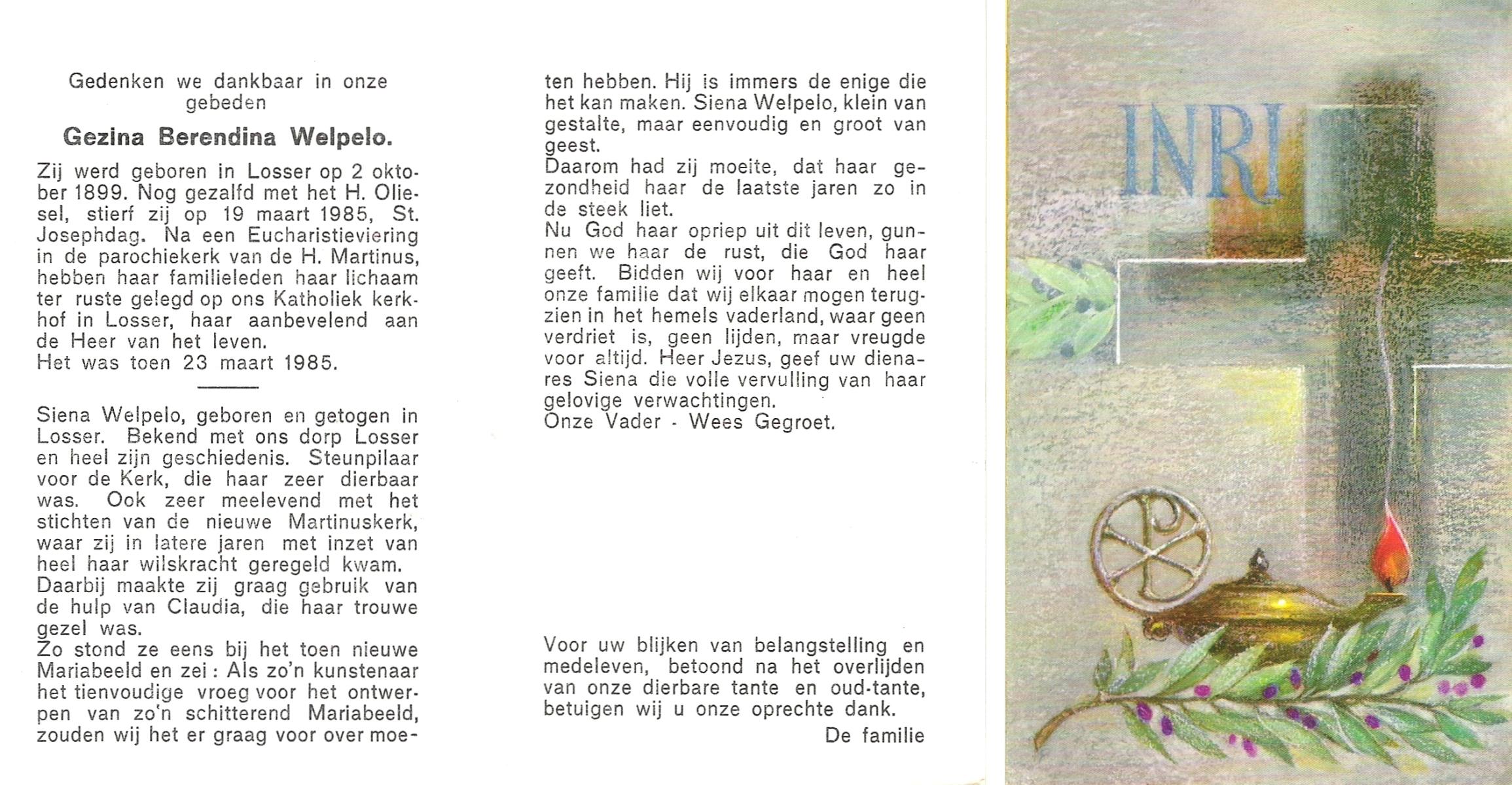 WELPELO, Gezina Berendina, geboren op 02-10-1899 te Losser, overleden op 19-3-1985 op 85-jarige leeftijd, begraven op 23-3-1985 te Losser.