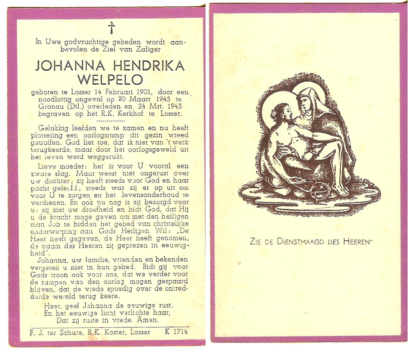 WELPELO, Johanna Hendrika, geboren op 14-2-1901 te Losser, overleden op 20-3-1945 te Gronau, Westf. (Dld.) op 44-jarige leeftijd, begraven op 24-3-1945 te Losser R.K.Kerkhof.