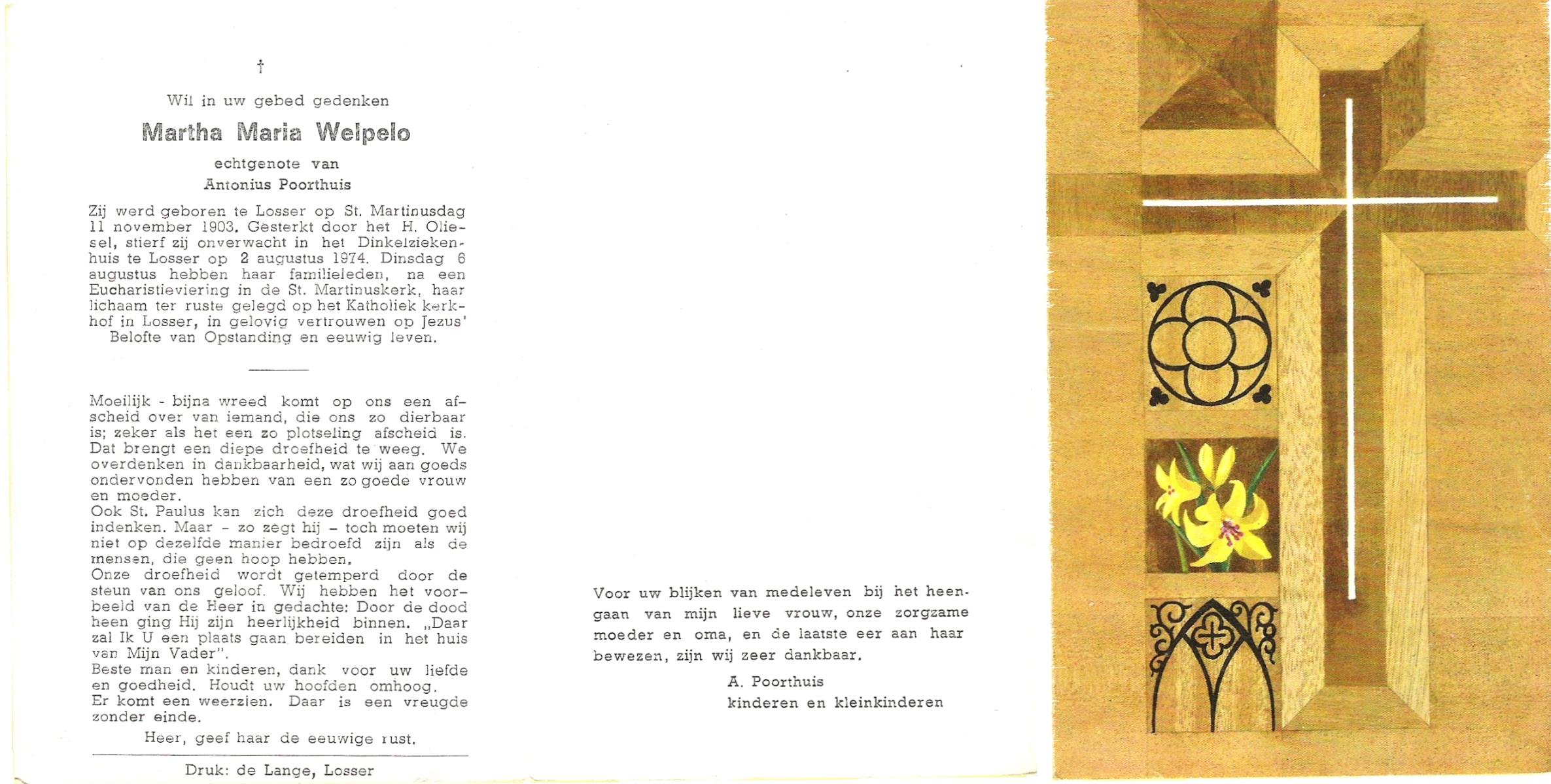WELPELO, Martha Maria, geboren op 11-11-1903 te Losser, overleden op 2-8-1974 te Losser op 70-jarige leeftijd, begraven op 6-8-1974 te Losser.