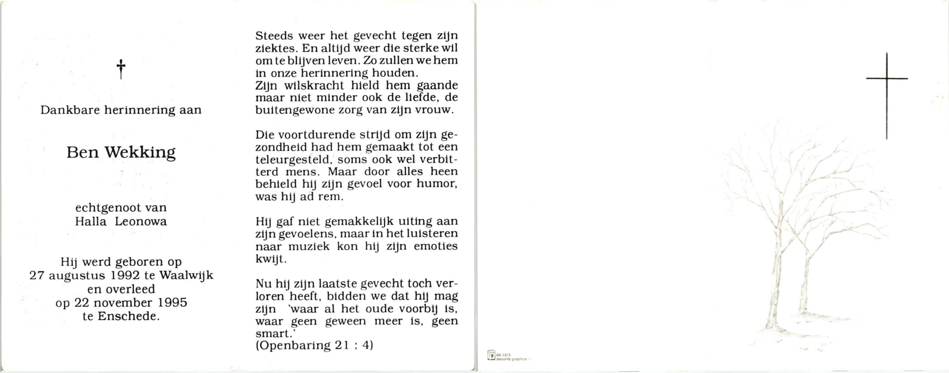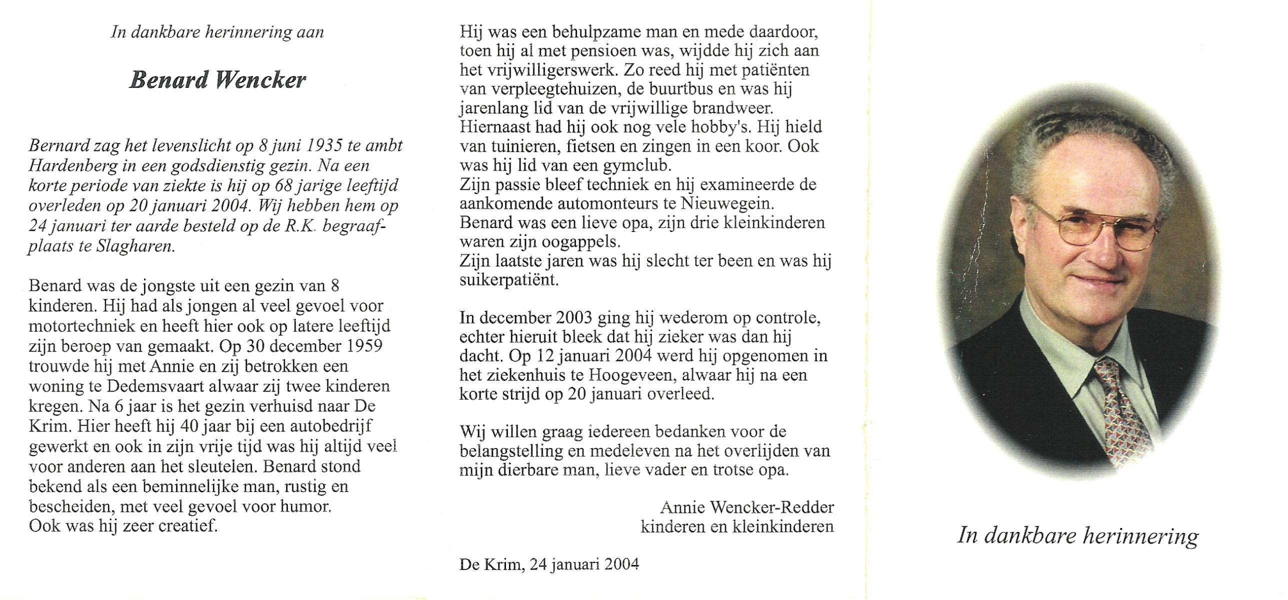 WENCKER, Benard (Bernard), geboren op 8-6-1935 te Hardenberg, overleden op 20-1-2004 op 68-jarige leeftijd, begraven op 24-1-2004 te Slagharen.