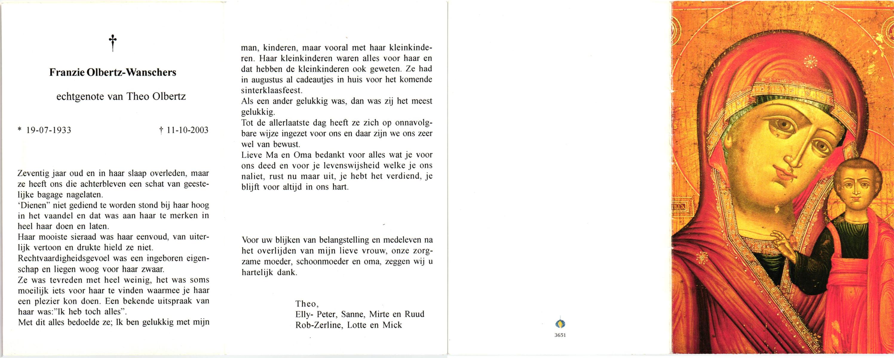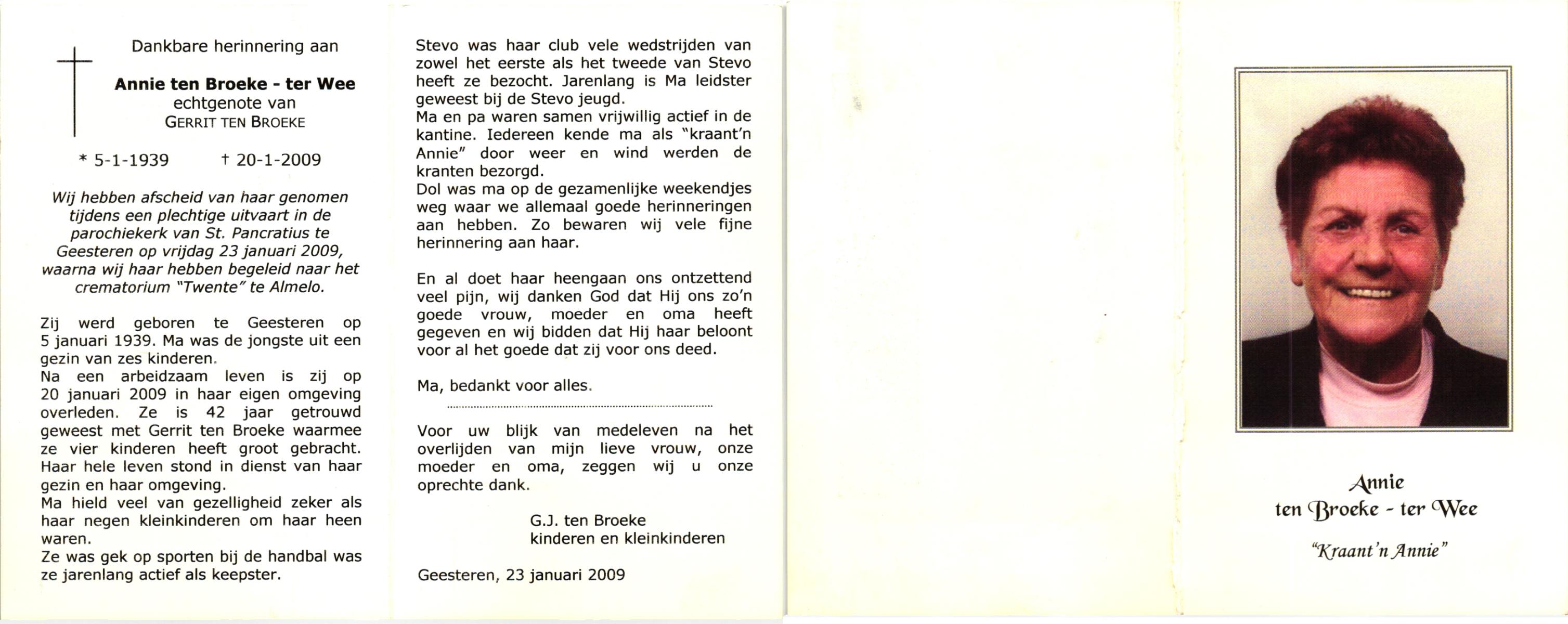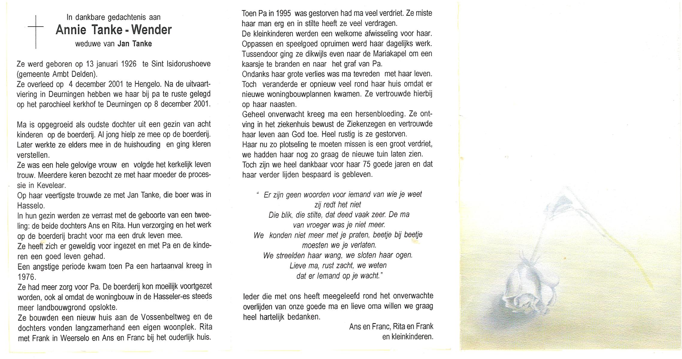 WENDER, Annie, geboren op 13-1-1926 te St. Isidorushoeve (gemeente Haaksbergen), overleden op 4-12-2001 te Hengelo (Ov.) op 75-jarige leeftijd, begraven op 8-12-2001 te Deurningen R.K.kerkhof.