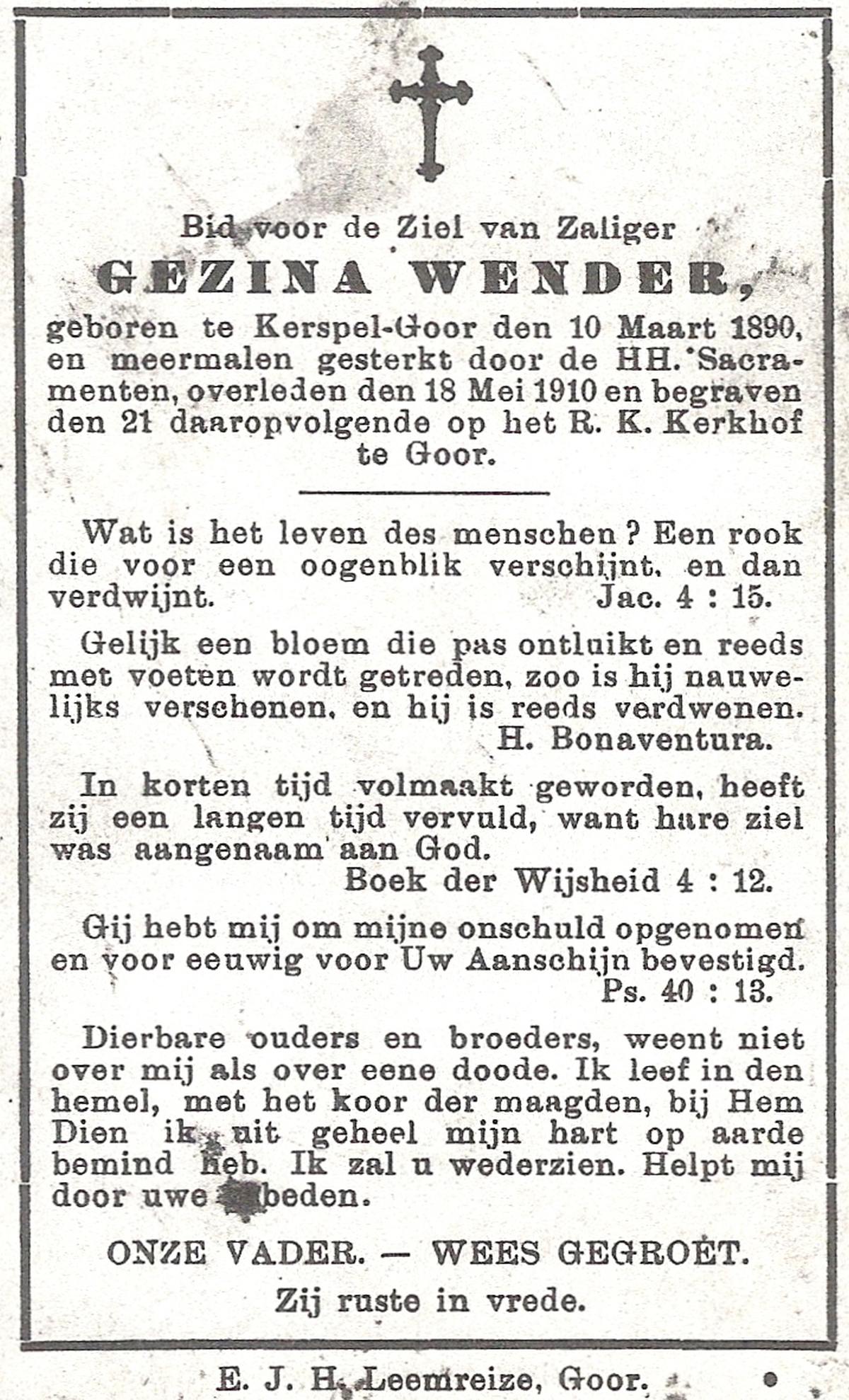 WENDER, Gezina, geboren op 10-03-1890 te Kerspel Goor, overleden op 18-5-1910 op 20-jarige leeftijd, begraven op 21-5-1910 te Kerspel Goor.