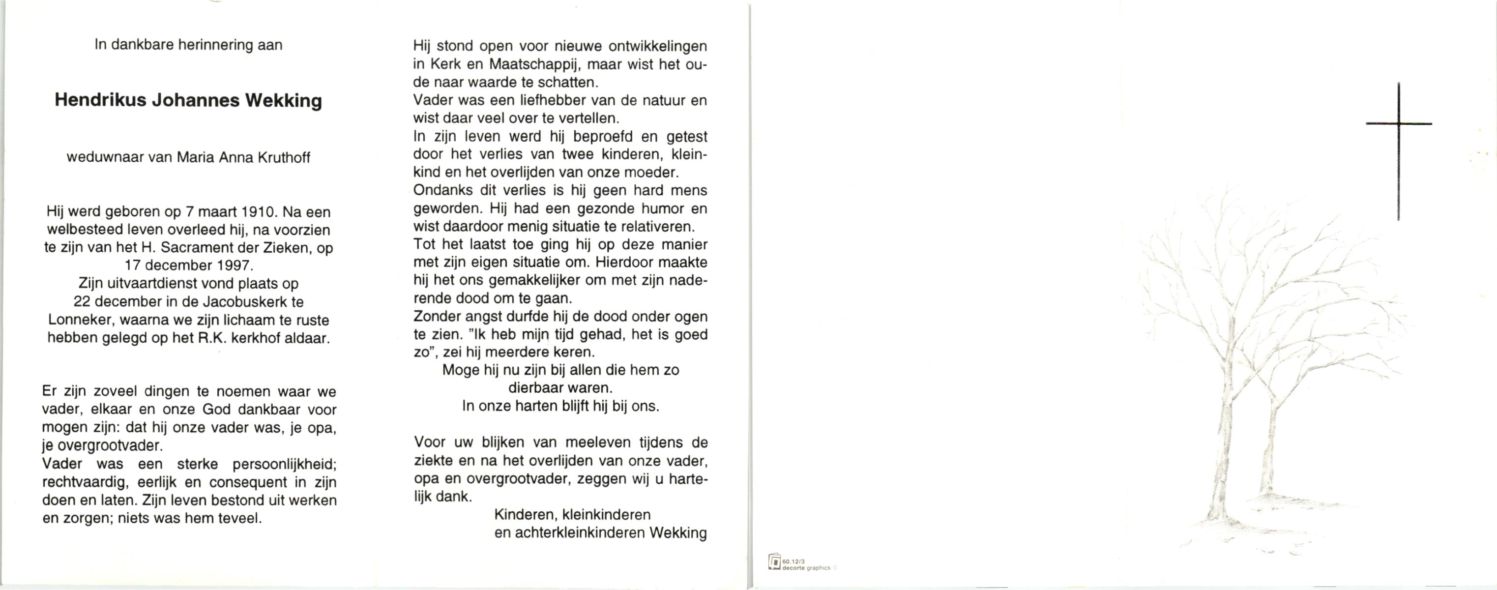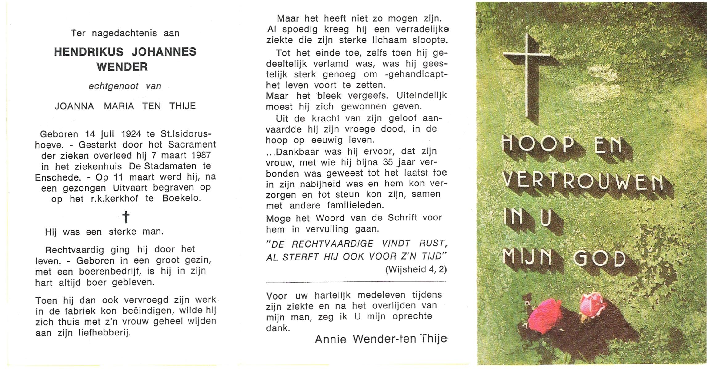 WENDER, Hendrikus Johannes, geboren op 14-7-1924 te St. Isidorushoeve (gemeente Haaksbergen), overleden op 7-3-1987 te Enschede op 62-jarige leeftijd, begraven op 11-3-1987 te Boekelo.