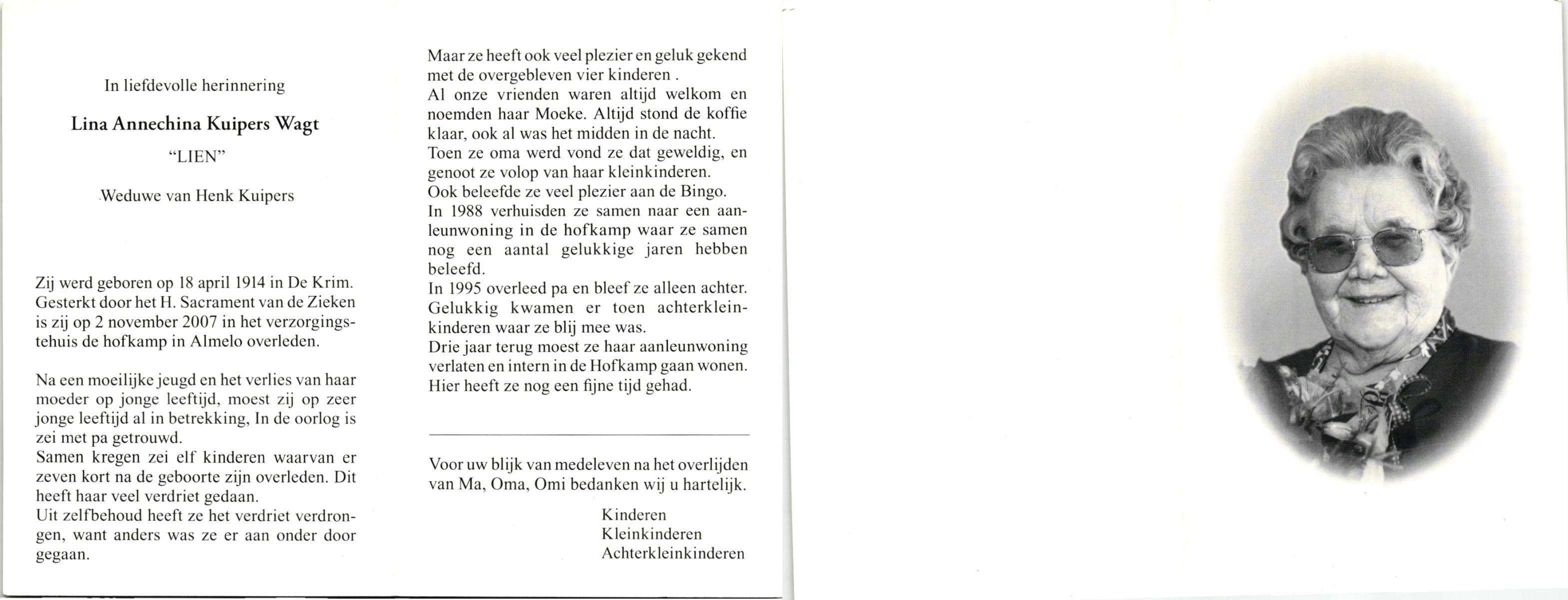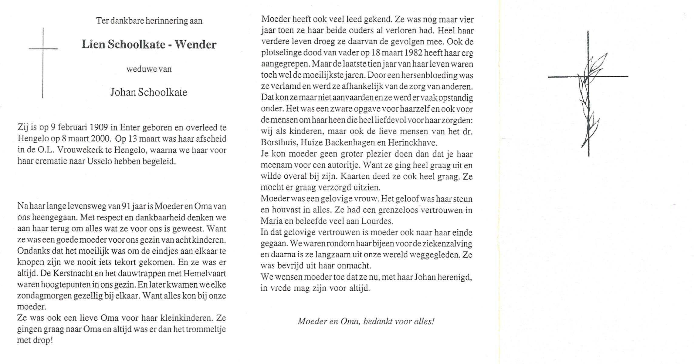 WENDER, Lien, geboren op 9-2-1909 te Wierden, Enter, overleden op 8-3-2000 te Hengelo (Ov.) op 91-jarige leeftijd, gecremeerd op 13-3-2000 te Usselo.