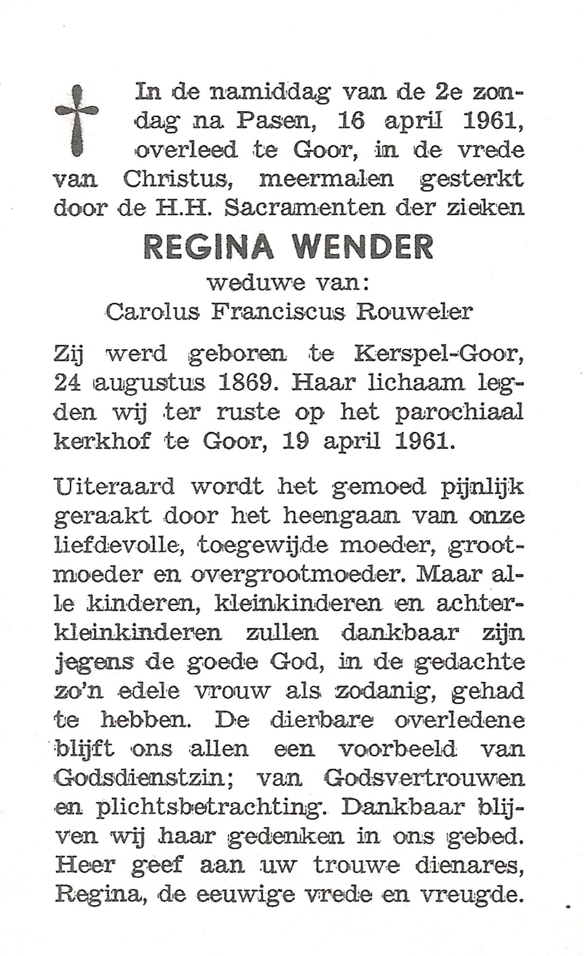 WENDER, Regina, geboren op 24-08-1869 te Kerspel Goor, overleden op 16-4-1961 te Goor op 91-jarige leeftijd, begraven op 19-4-1961 te Goor.