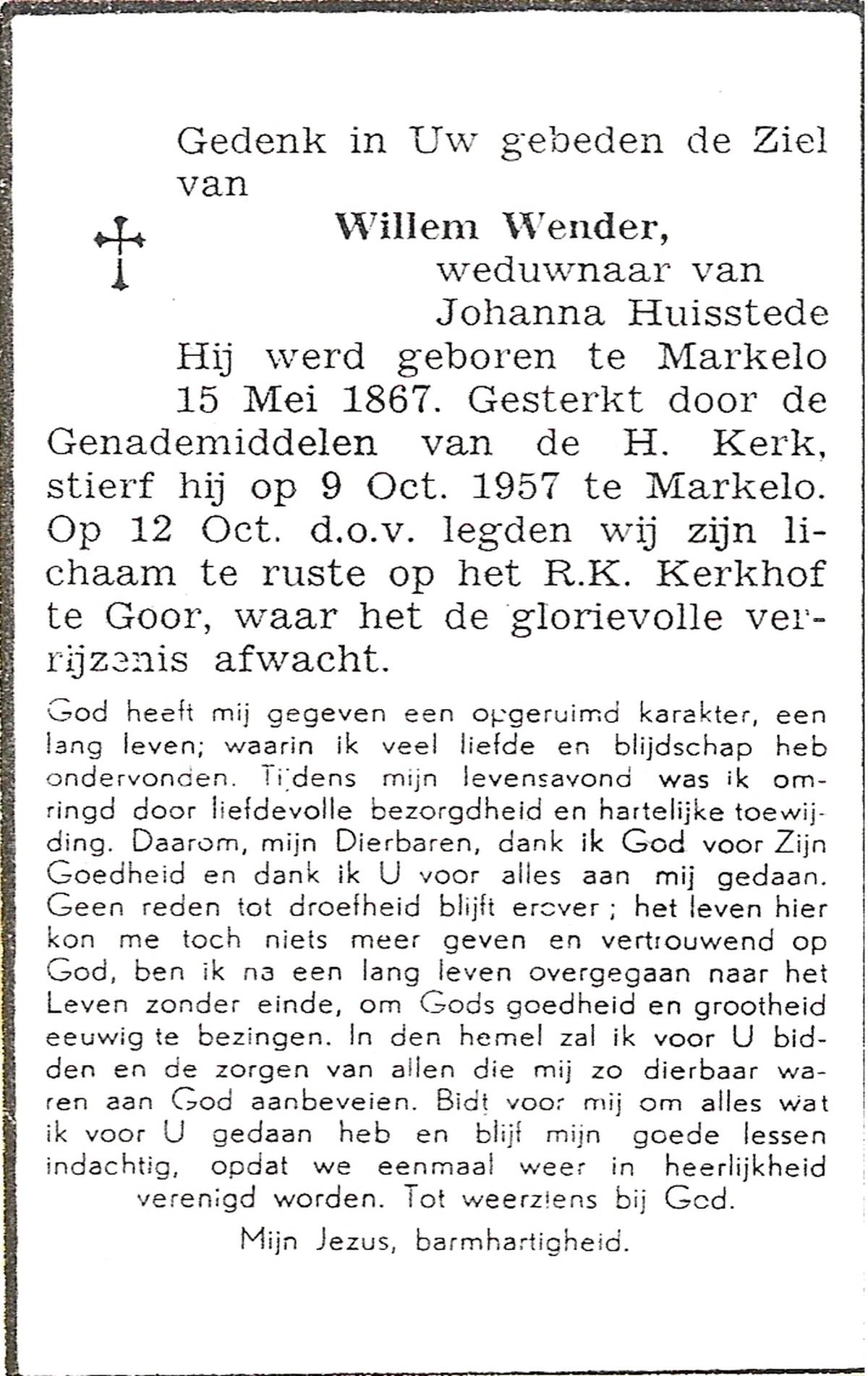 WENDER, Willem, geboren op 15-05-1867 te Markelo, overleden op 9-10-1957 te Markelo op 90-jarige leeftijd, begraven op 12-10-1957 te Markelo.
