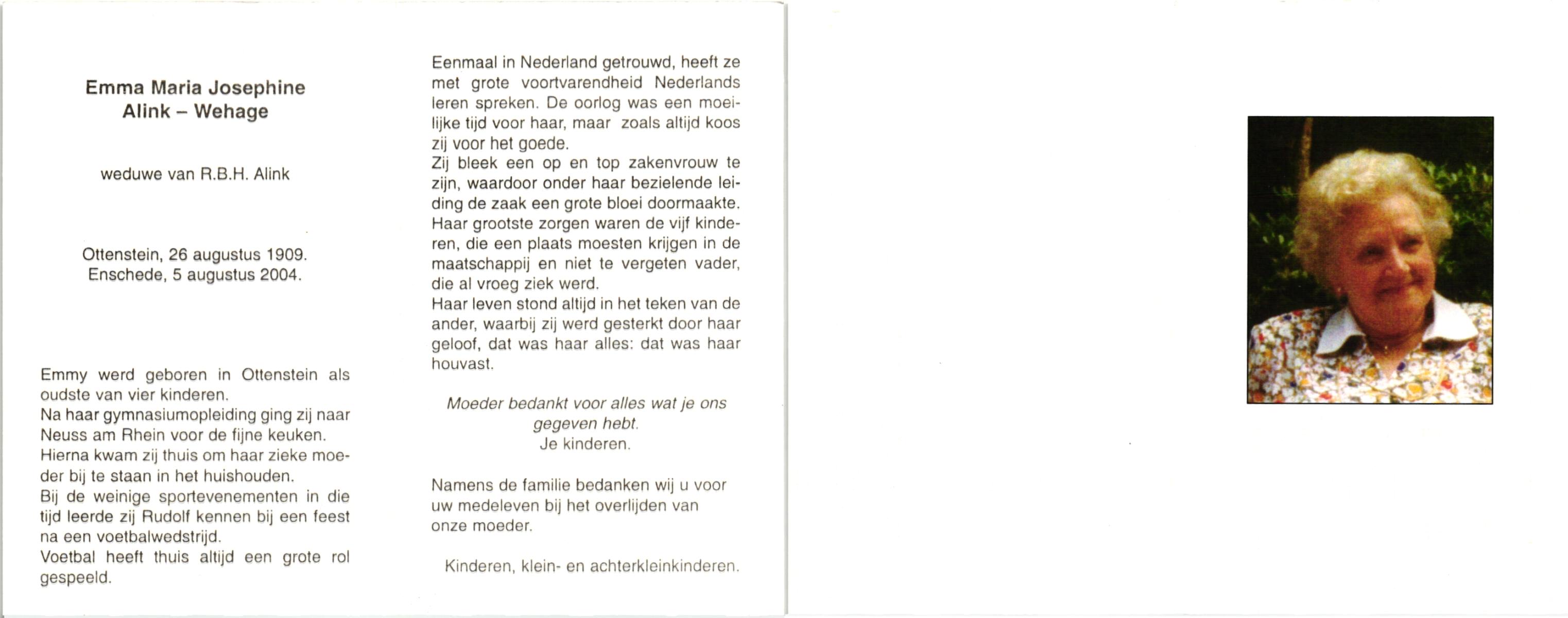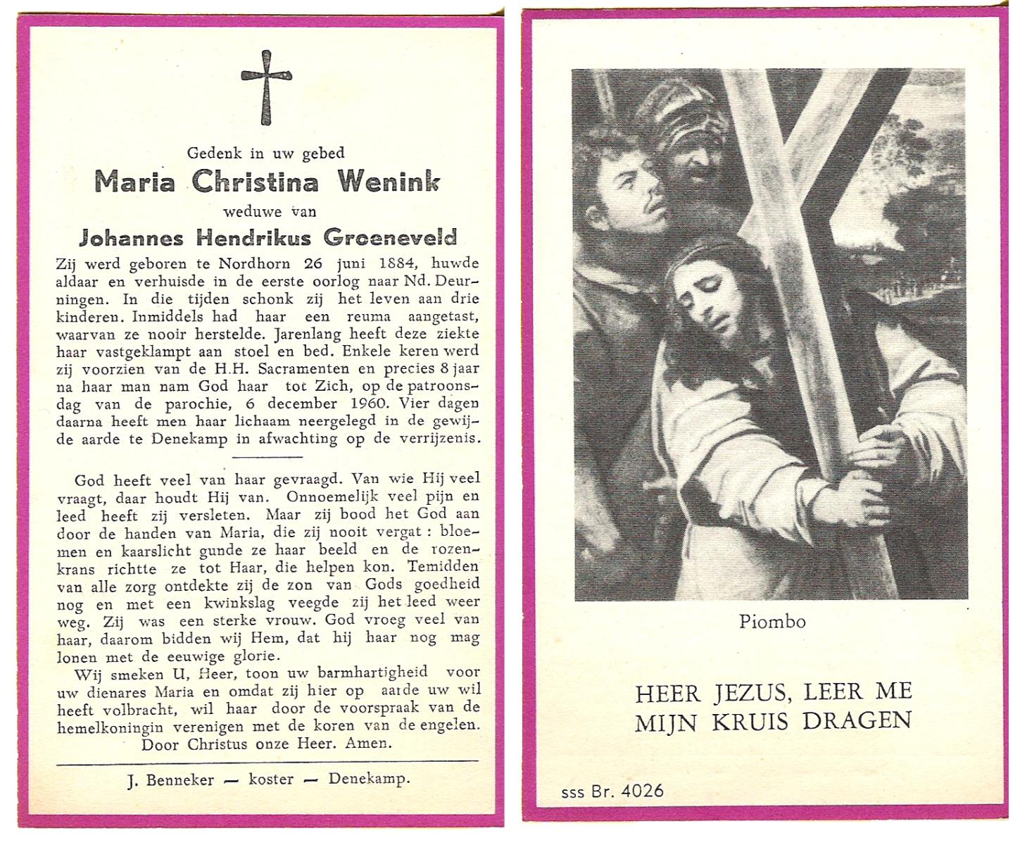 WENINK, Maria Christina, geboren op 26-06-1884 te Nordhorn (Dld.), overleden op 6-12-1960 op 76-jarige leeftijd, begraven op 10-12-1960 te Denekamp R.K.kerkhof.