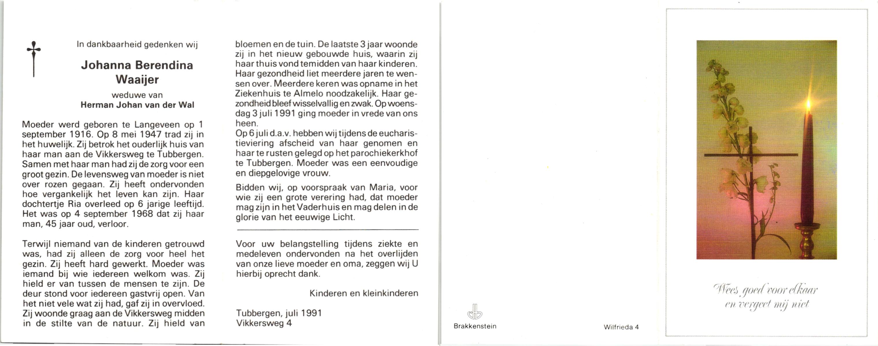 WAAIJER, , Johanna Berendina, geboren op 1-9-1916 te Langeveen, overleden op 3-7-1991 op 74-jarige leeftijd, begraven op 6-7-1991 te Tubbergen.