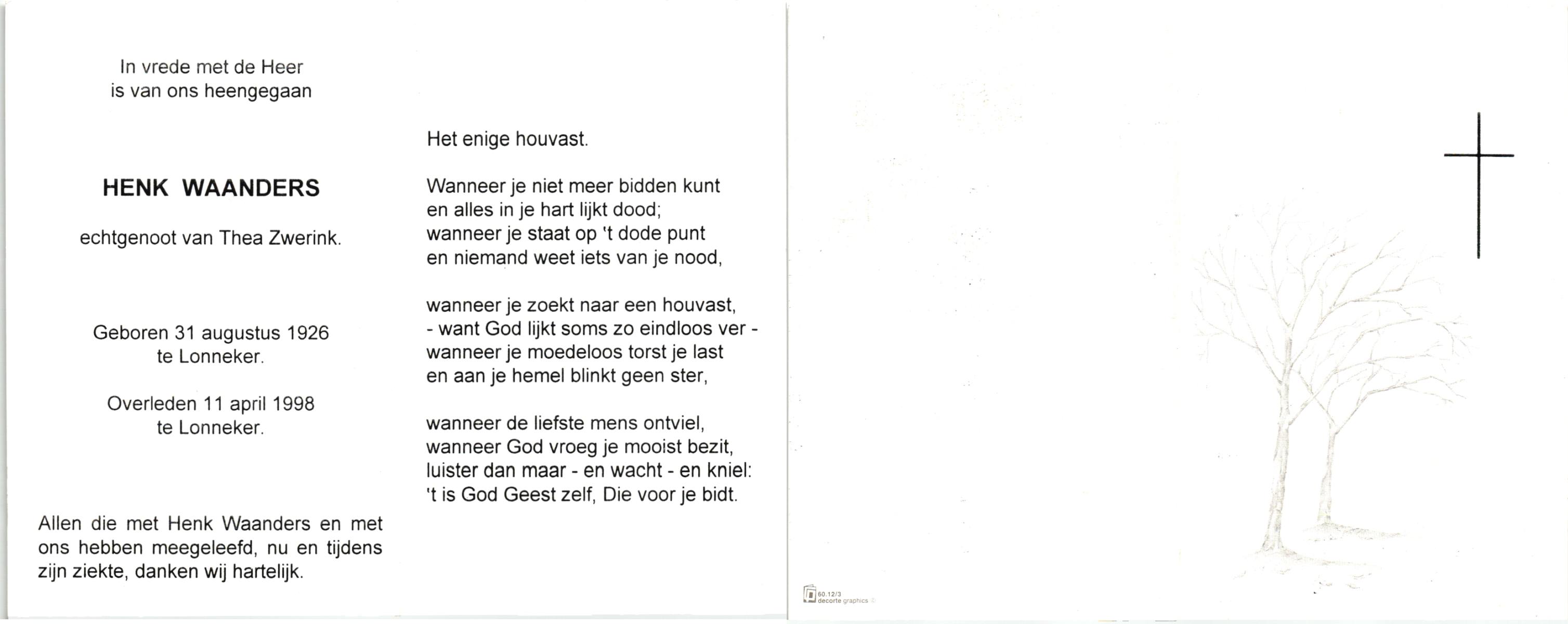 WAANDERS, , Henk, geboren op 31-8-1926 te Lonneker, overleden op 11-4-1998 te Lonneker op 71-jarige leeftijd.