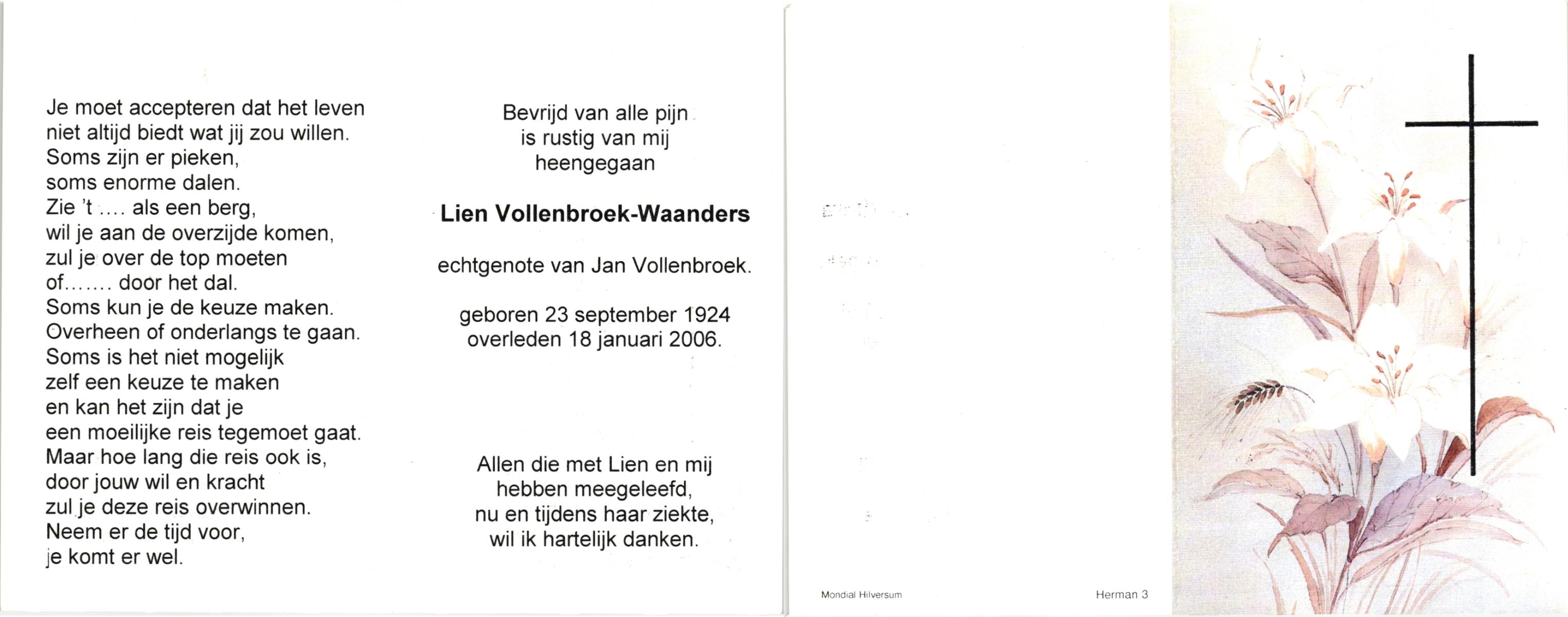 WAANDERS, , Lien, geboren op 23-9-1924, overleden op 18-1-2006 op 81-jarige leeftijd.