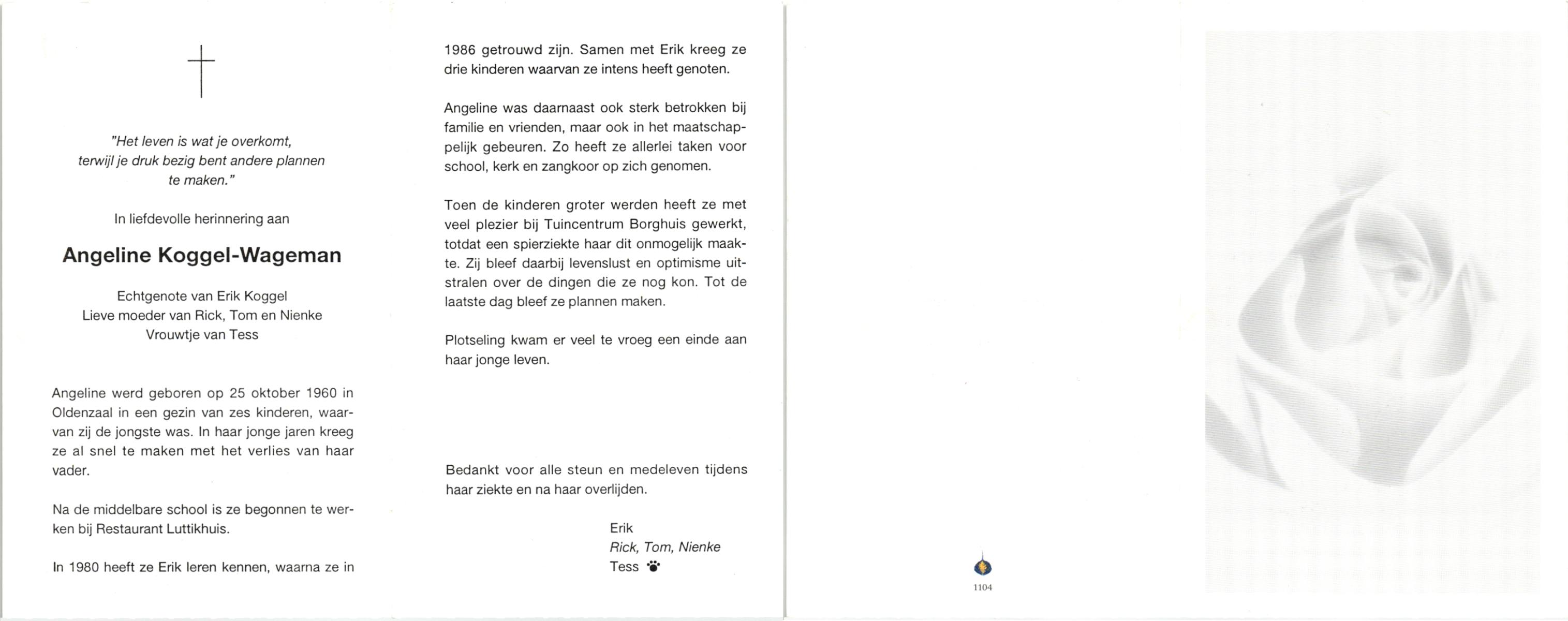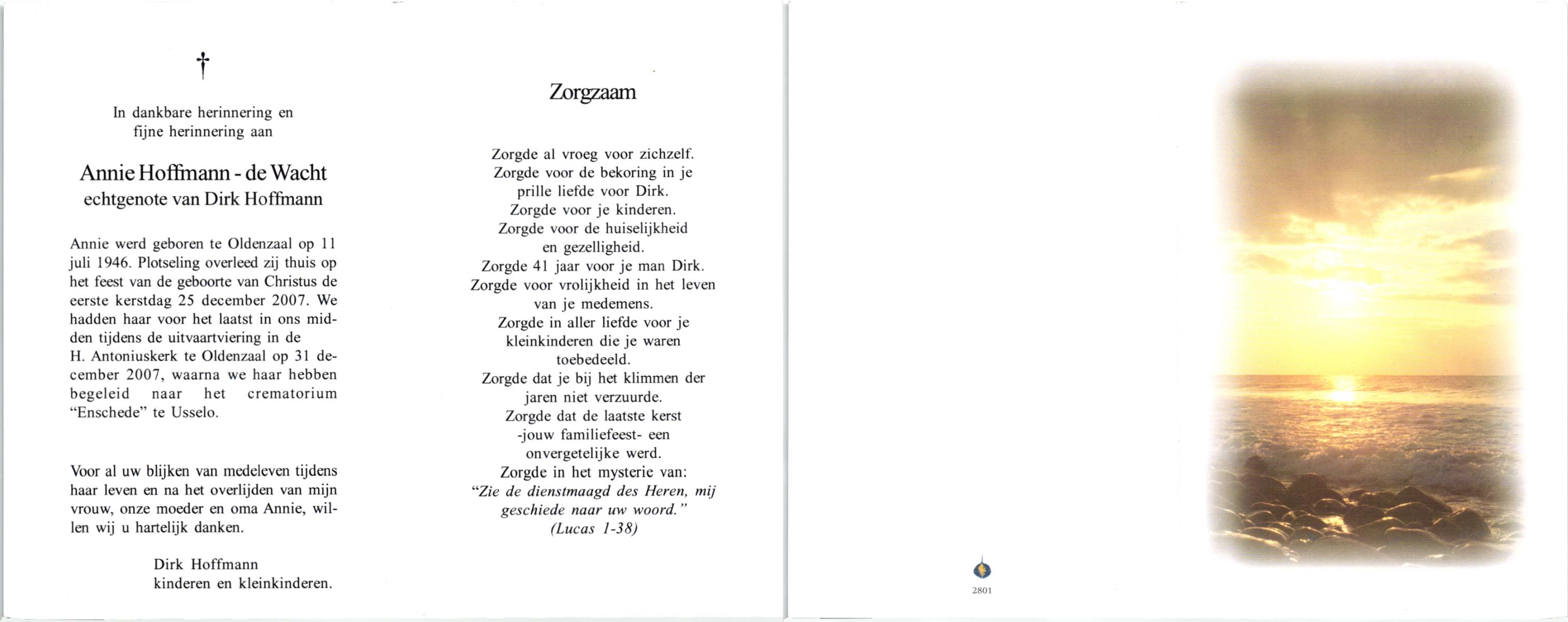 WACHT, de, Annie, geboren op 11-7-1946 te Oldenzaal, overleden op 25-12-2007 te Oldenzaal op 61-jarige leeftijd, gecremeerd op 31-12-2007 te Usselo.