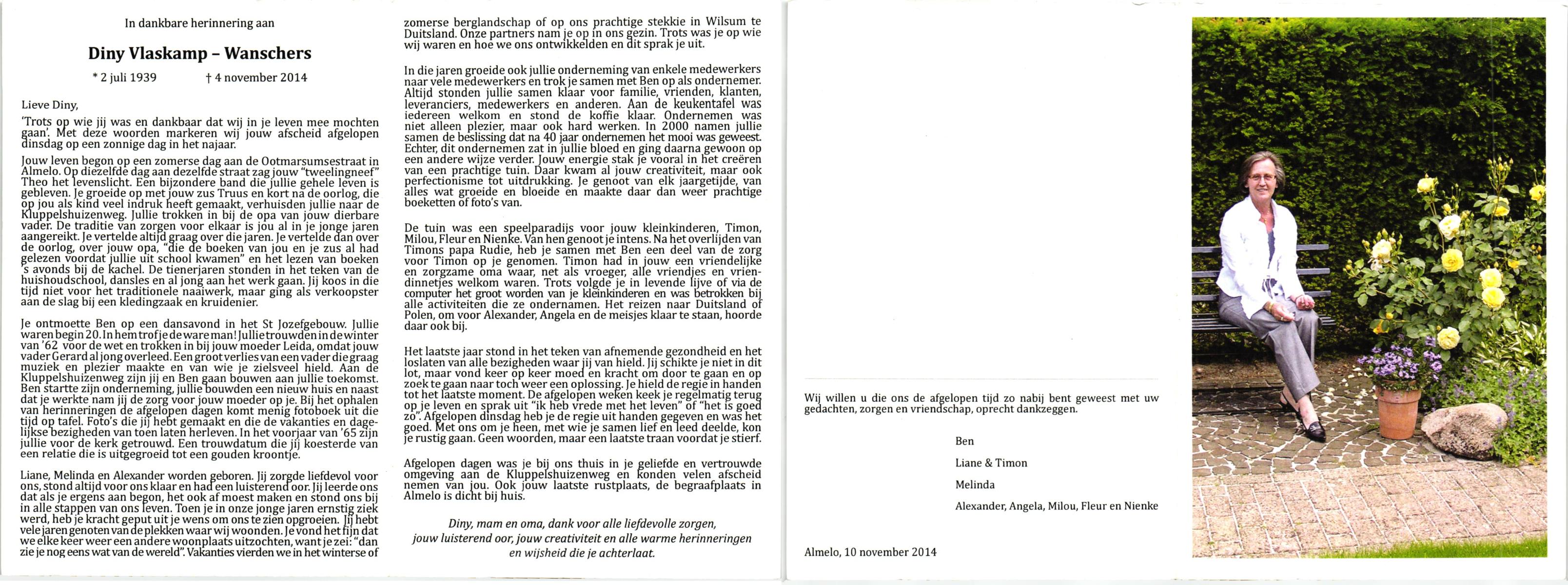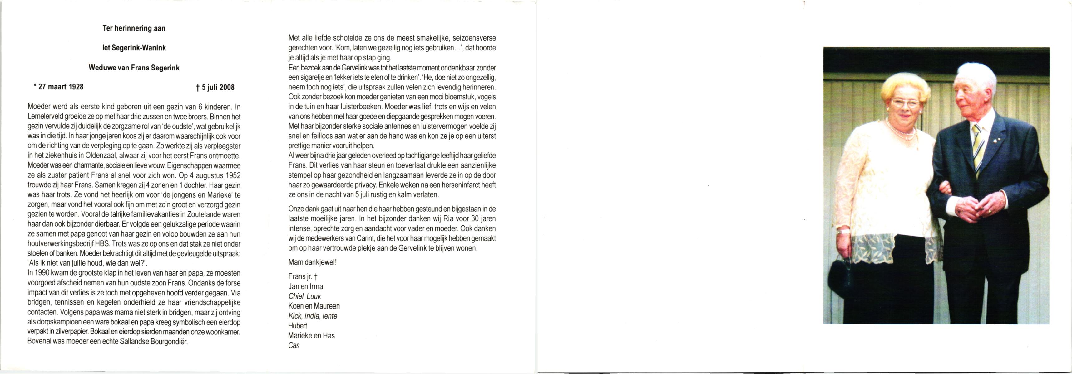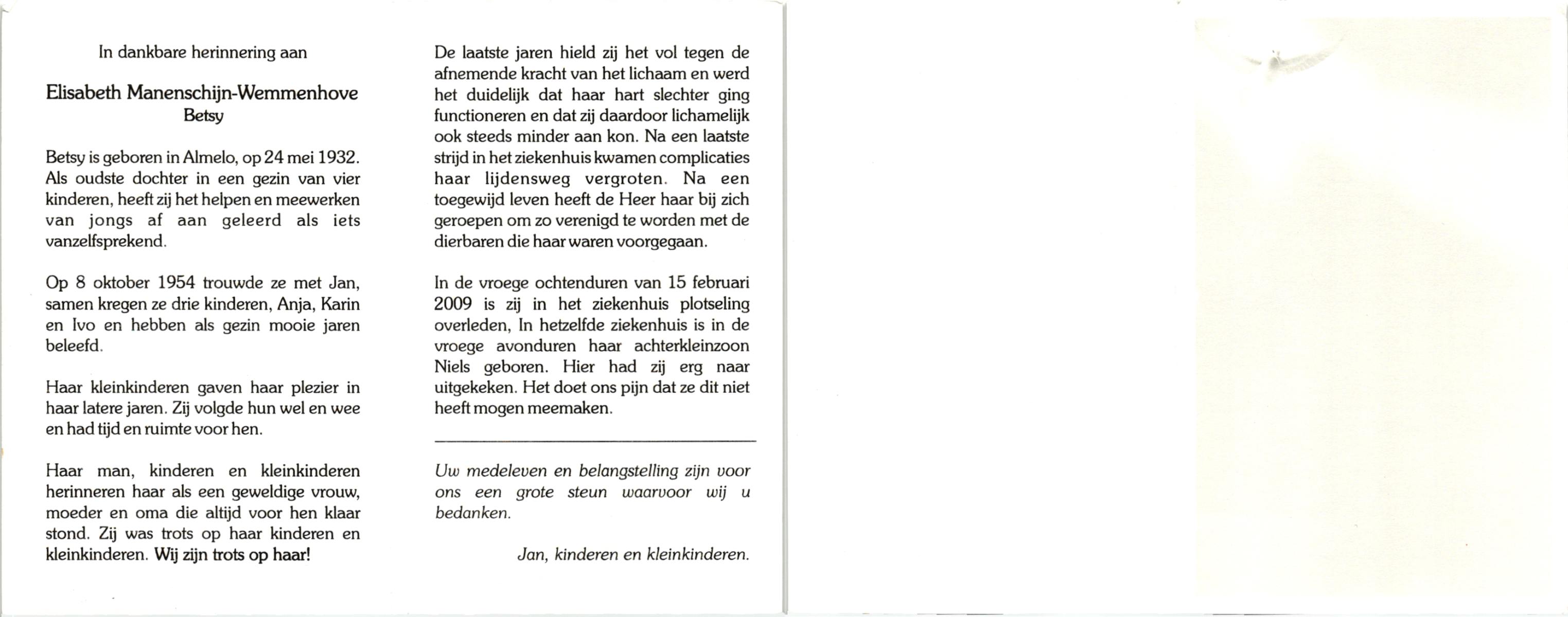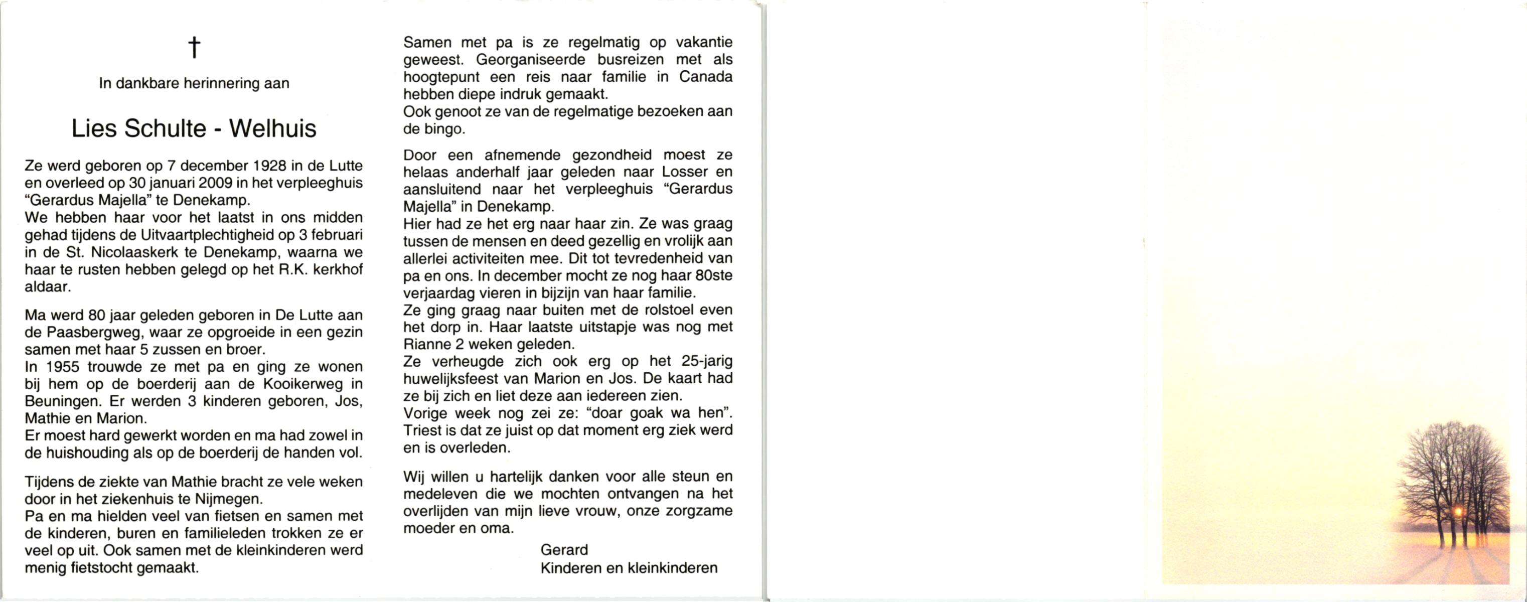 WELHUIS, , Lies, geboren op 7-12-1928 te De Lutte, overleden op 30-1-2009 te Denekamp op 80-jarige leeftijd, begraven op 3-2-2009 te Denekamp.