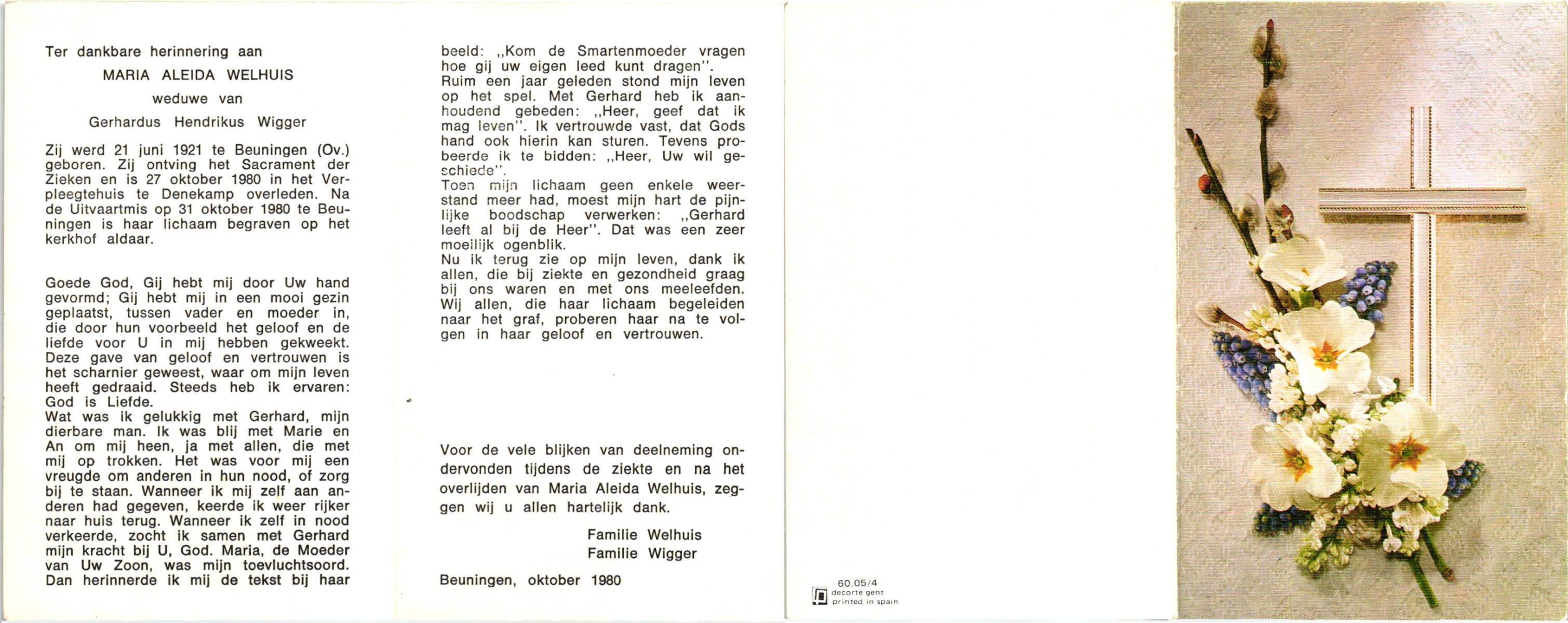 WELHUIS, , Maria Aleida, geboren op 21-6-1921 te Beuningen, overleden op 27-10-1980 te Denekamp op 59-jarige leeftijd, begraven op 31-10-1980 te Denekamp.