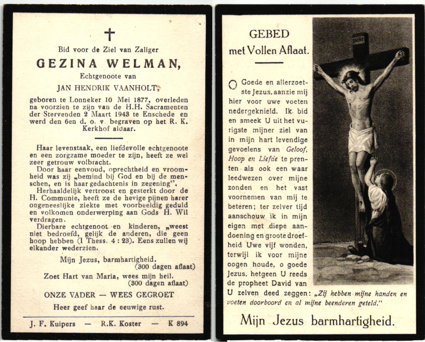 WELMAN, , Gezina, geboren op 10-05-1877 te Lonneker, overleden op 2-3-1943 te Enschede op 63-jarige leeftijd, begraven op 6-3-1943 te Enschede.