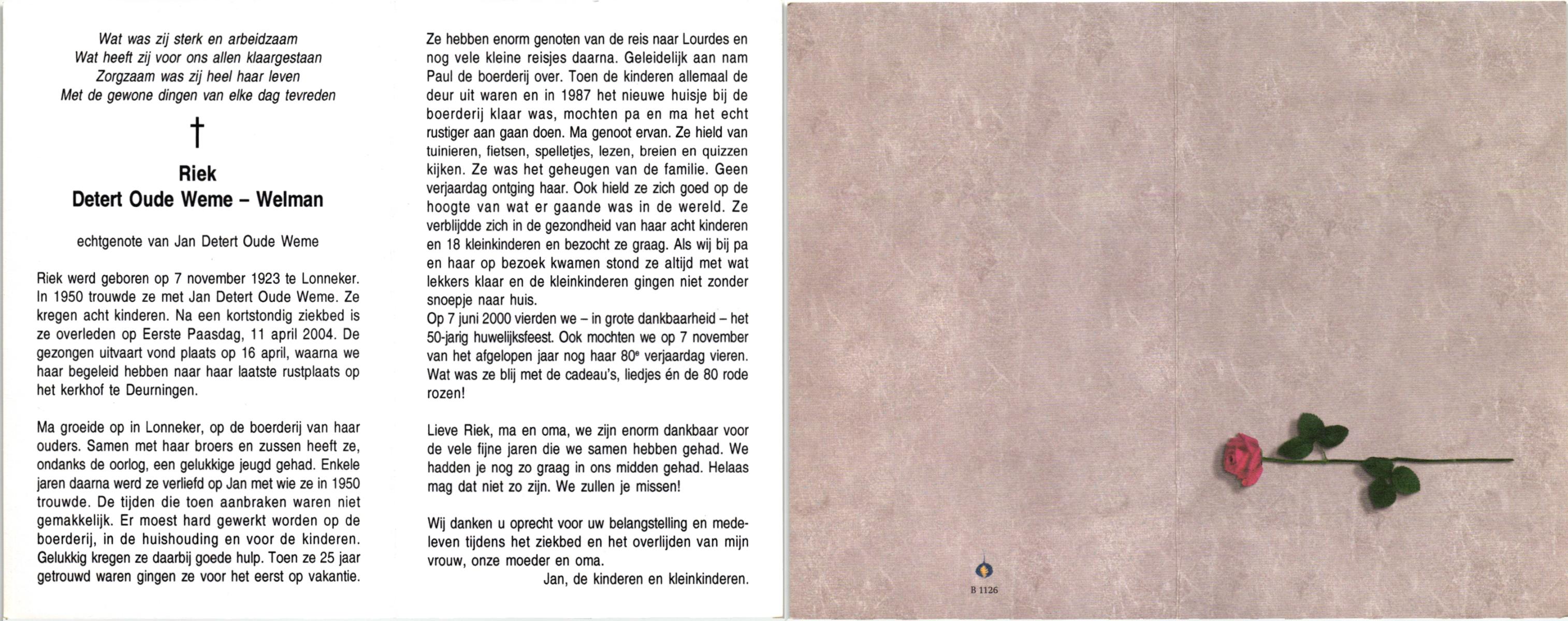 WELMAN, , Riek, geboren op 7-11-1923 te Lonneker, overleden op 11-4-2004 op 80-jarige leeftijd, begraven te Deurningen.