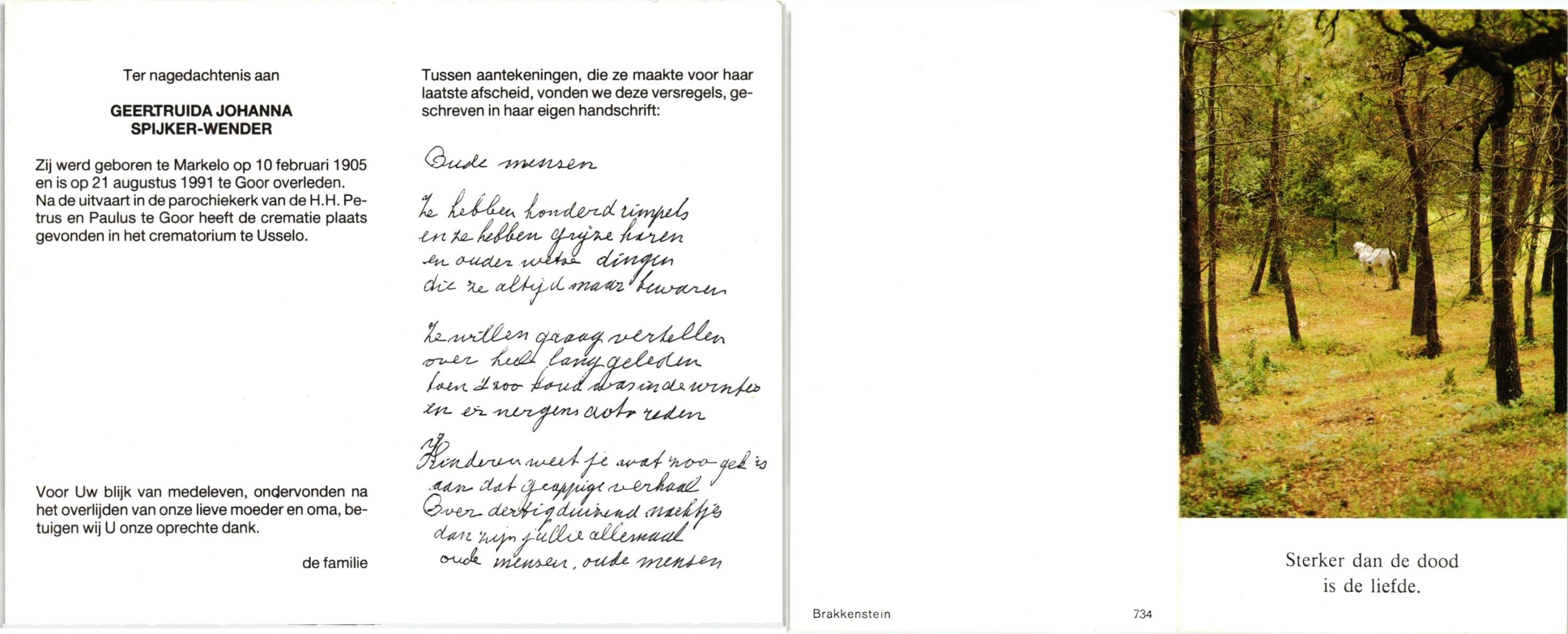 WENDER, , Geertruida Johanna, geboren op 10-2-1905 te Markelo, overleden op 21-8-1991 te Goor op 86-jarige leeftijd, gecremeerd te Usselo.