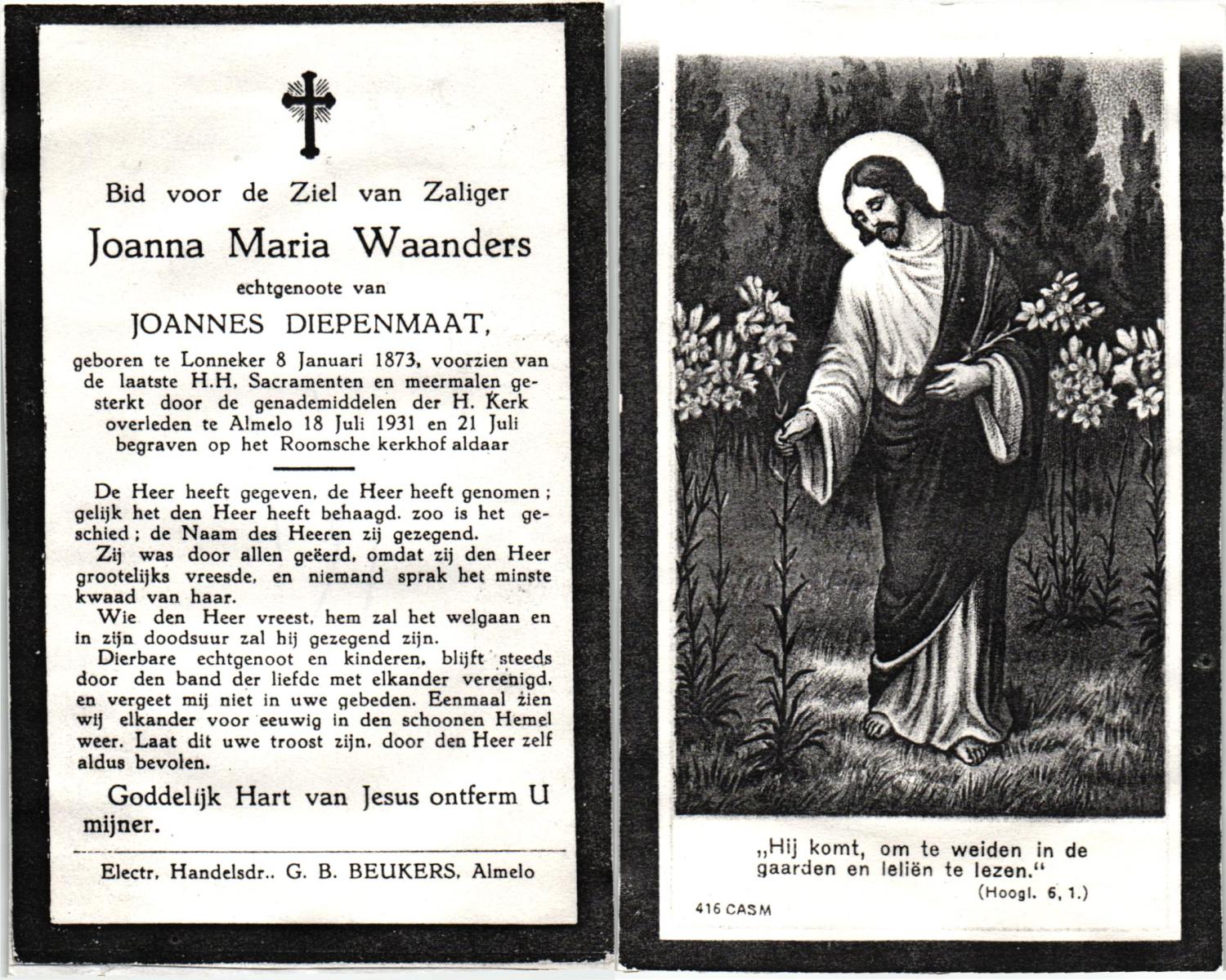 WAANDERS, Joanna Maria, geboren op 08-01-1873 te Lonneker, overleden op 18-7-1931 te Almelo op 58-jarige leeftijd, begraven op 21-7-1931 te Almelo.