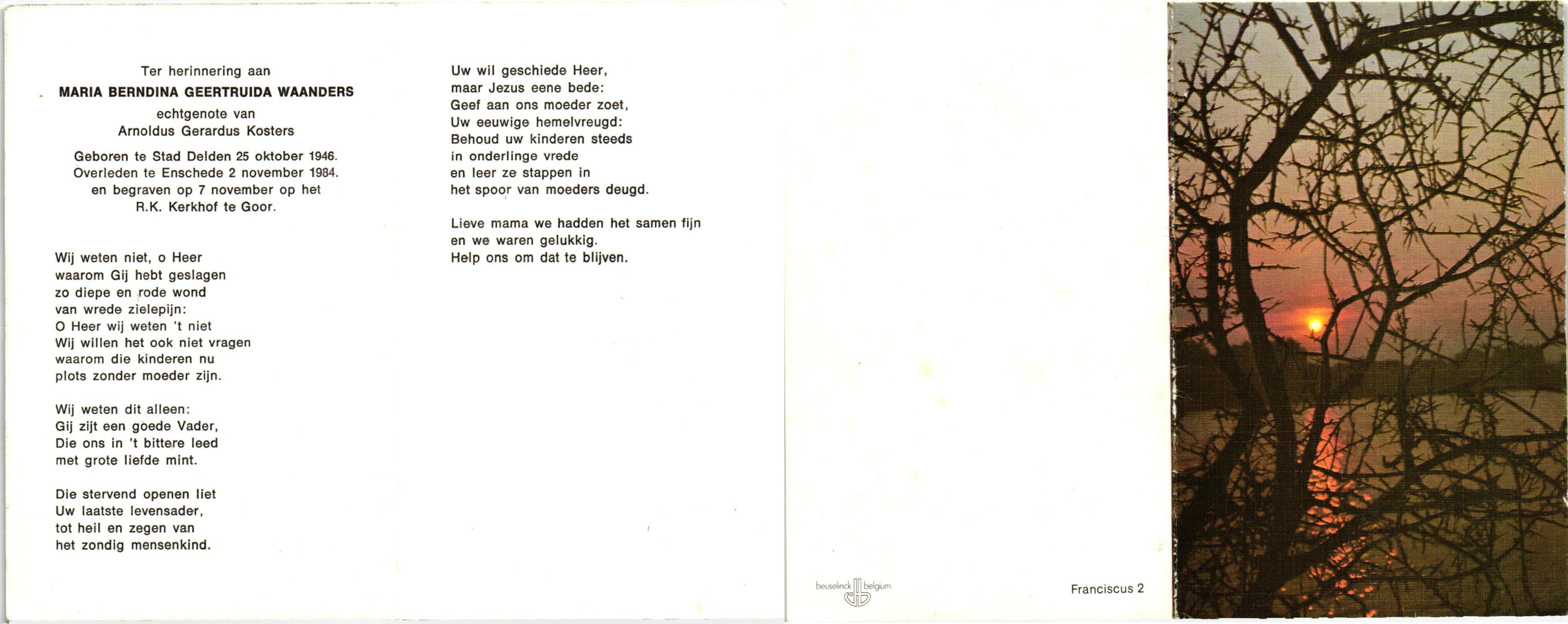 WAANDERS, Maria Berndina Geertruida, geboren op 25-10-1946 te Delden, Stad, overleden op 2-11-1984 te Enschede op 38-jarige leeftijd, begraven op 7-11-1984 te Goor.