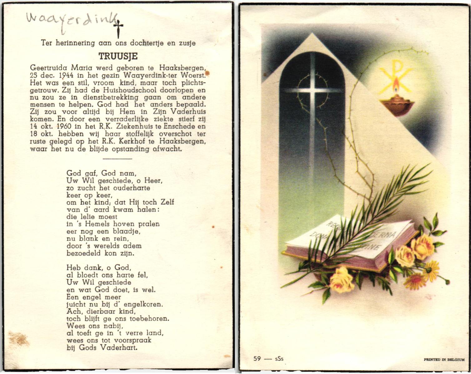 WAAYERDINK, Truusje (Geertruida Maria), geboren op 25-12-1944 te Haaksbergen, overleden op 14-10-1960 te Enschede, ziekenhuis op 15-jarige leeftijd, begraven op 18-10-1960 te Haaksbergen.