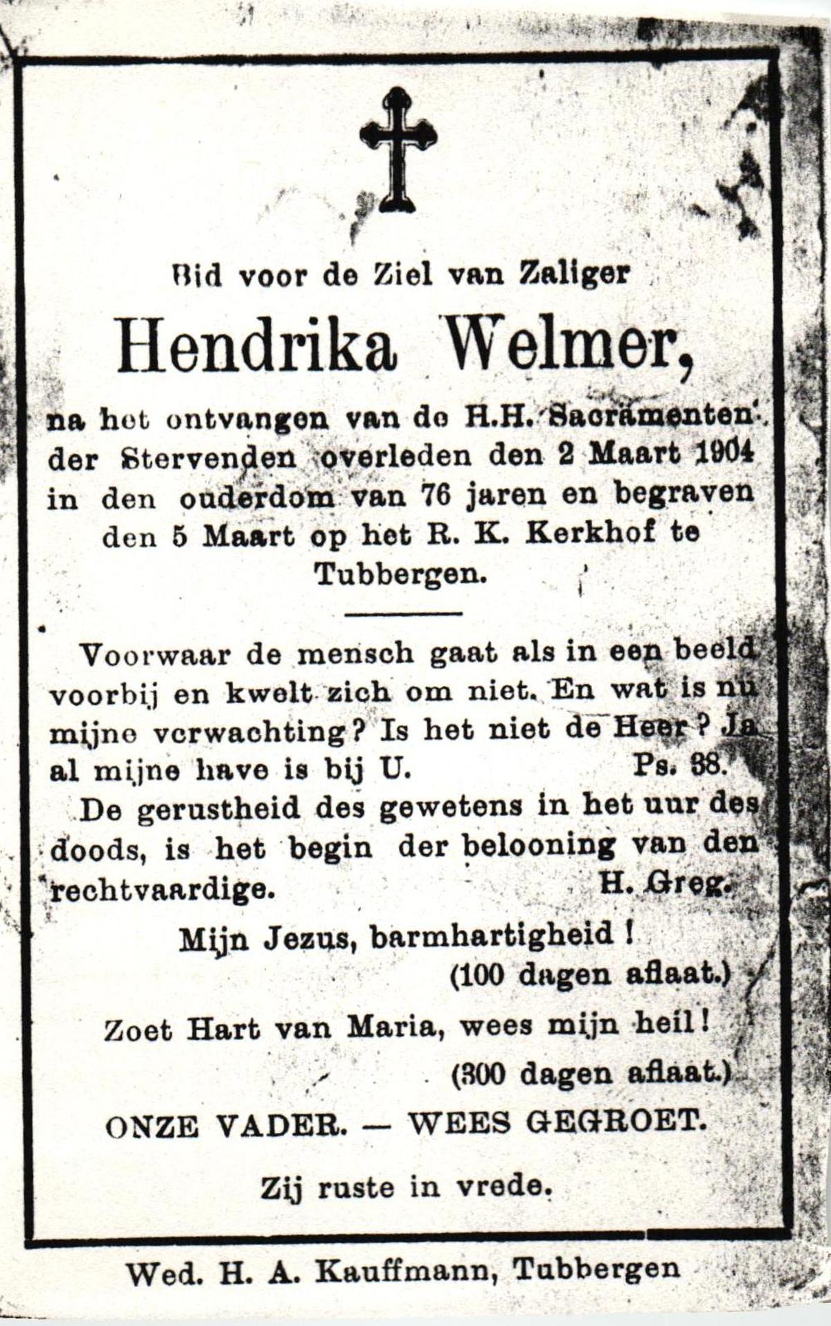 WELMER, Hendrika, overleden op 2-3-1904 te Tubbergen op 76-jarige leeftijd, begraven op 5-3-1904 te Tubbergen.
