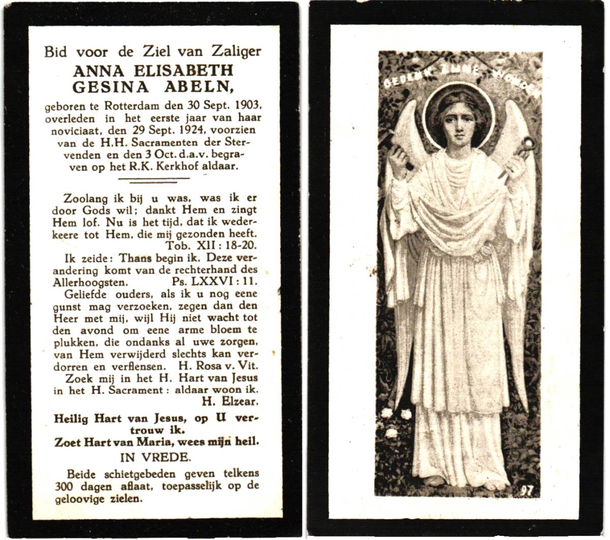 ABELN, Anna Elisabeth Gesina, geboren op 30-9-1903 te Rotterdam, overleden op 29-9-1924 te Rotterdam op 20-jarige leeftijd, begraven op 3-10-1924 te Rotterdam.