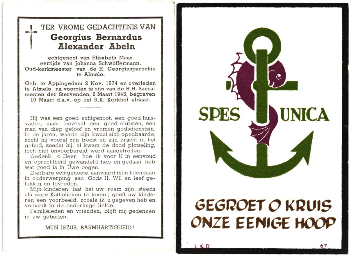 ABELN, Georgius Bernardus Alexander, geboren op 09-11-1874 te Appingedam, overleden op 6-3-1945 te Almelo op 70-jarige leeftijd, begraven op 10-3-1945 te Almelo.