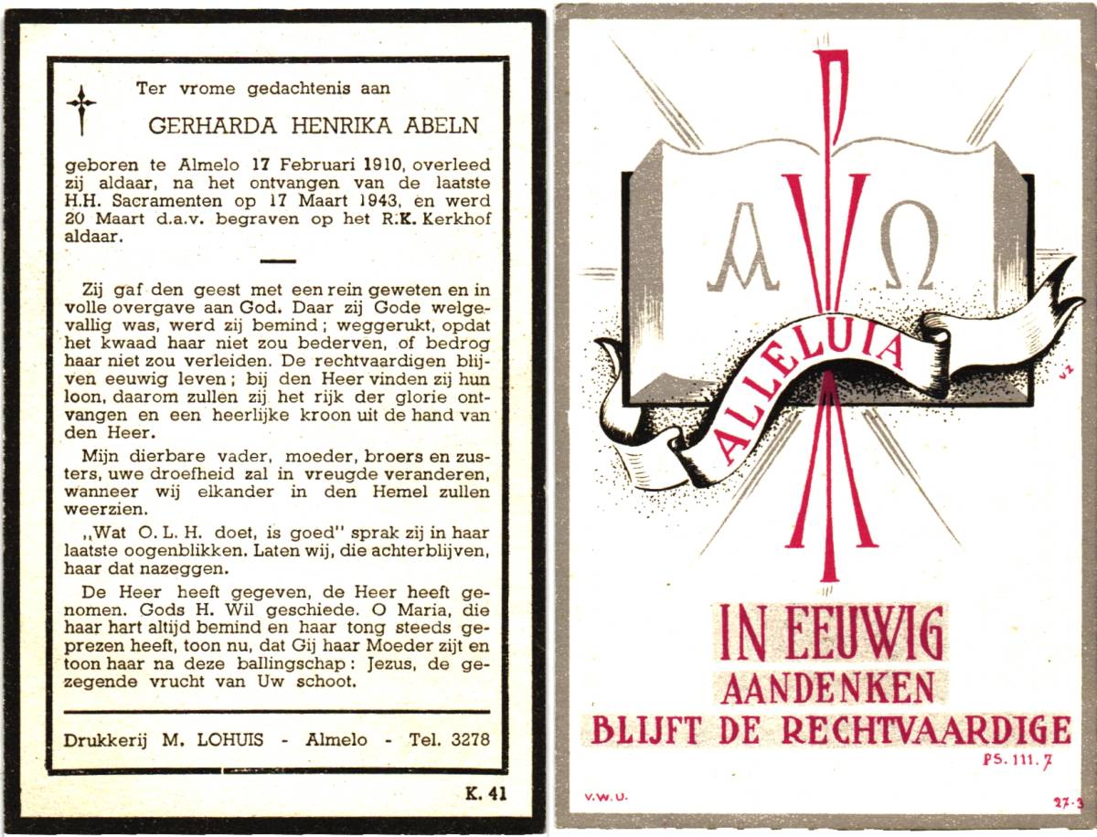 ABELN, Gerharda Hendrika, geboren op 17-2-1910 te Almelo, overleden op 17-3-1943 te Almelo op 33-jarige leeftijd, begraven op 20-3-1943 te Almelo.