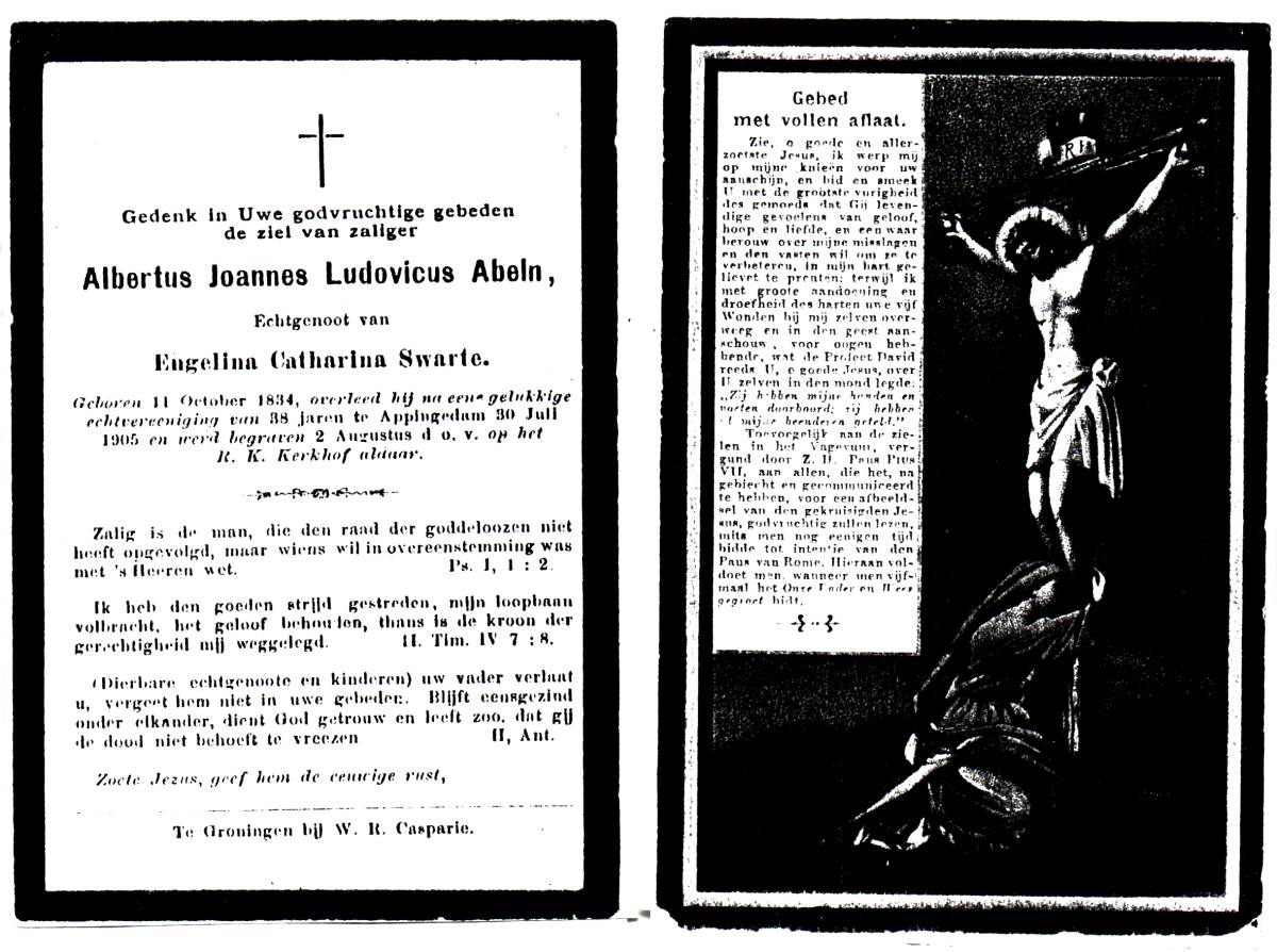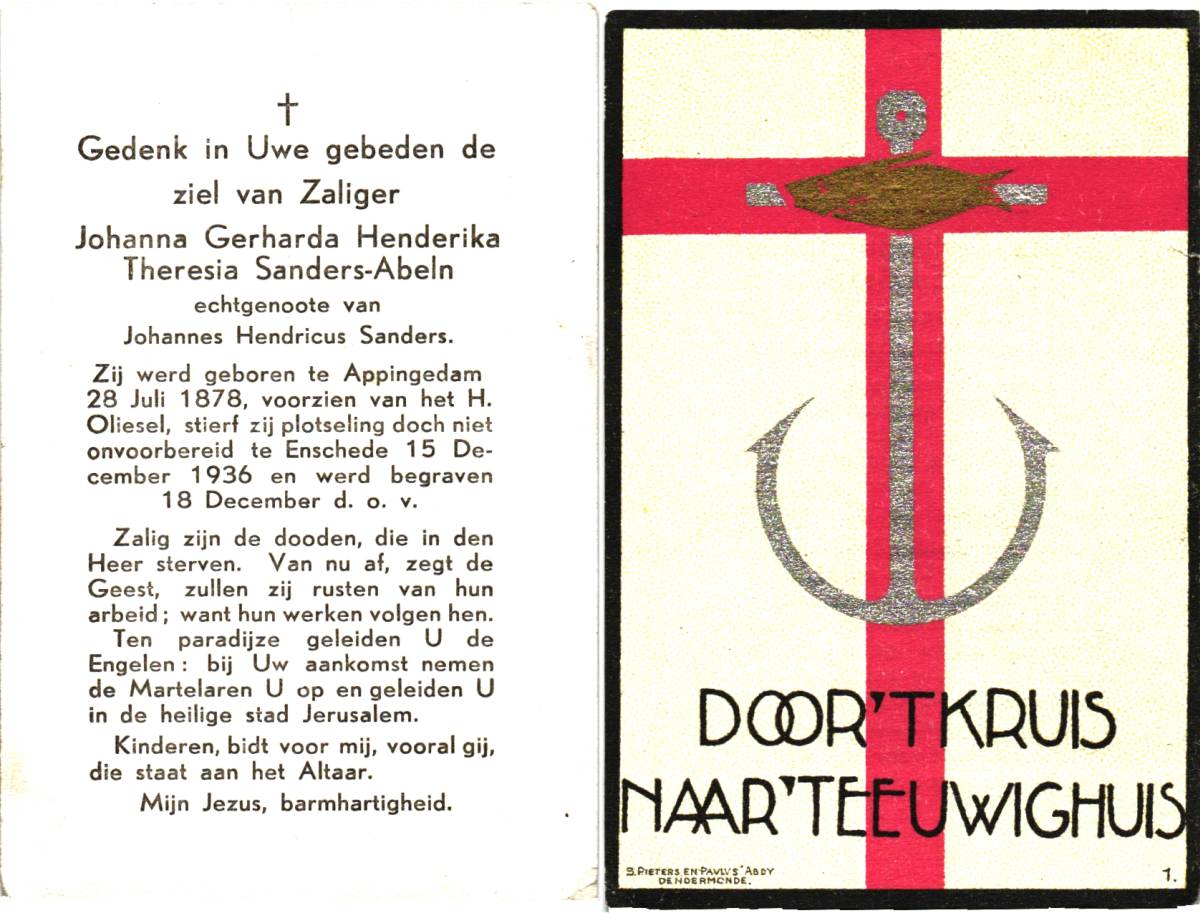 ABELN, Johanna Gerharda Henderika Theresia, geboren op 28-07-1878 te Appingedam, overleden op 15-12-1936 te Enschede op 58-jarige leeftijd, begraven op 18-12-1936 te Enschede.