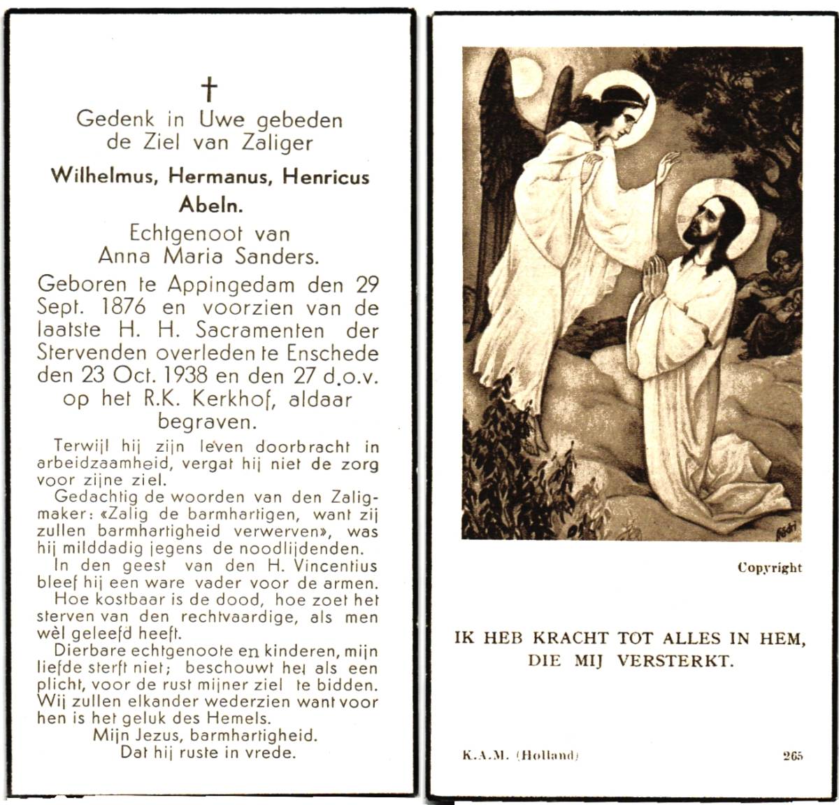 ABELN, Wilhelmus Hermanus Henricus, geboren op 29-09-1876 te Appingedam, overleden op 23-10-1938 te Enschede op 62-jarige leeftijd, begraven op 23-10-1938 te Enschede.