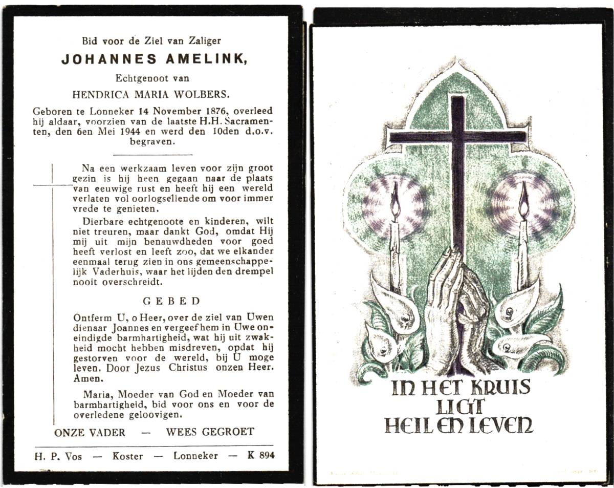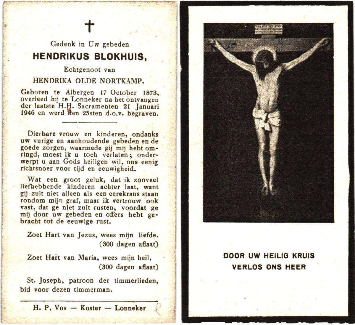 BLOKHUIS, Hendrikus, geboren op 17-10-1873 te Albergen, overleden op 21-1-1946 te Lonneker op 72-jarige leeftijd, begraven op 25-1-1946 te Lonneker.