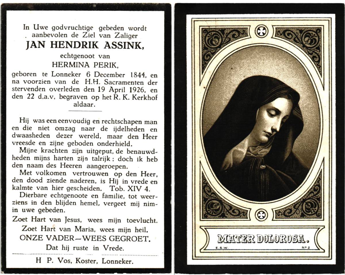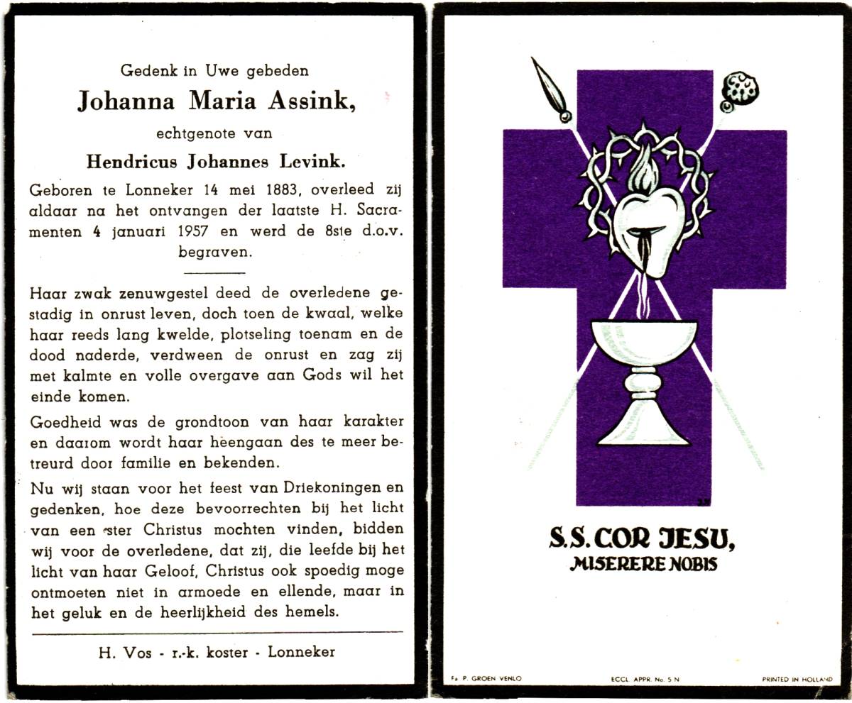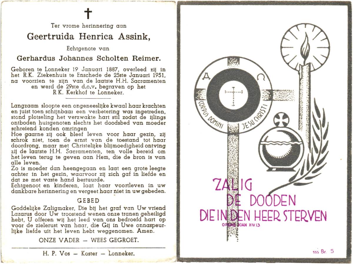 ASSINK, Geertruida Henrica, geboren op 19-01-1887 te Lonneker, overleden op 25-1-1951 te Enschede, ziekenhuis op 64-jarige leeftijd, begraven op 29-1-1951 te Lonneker.