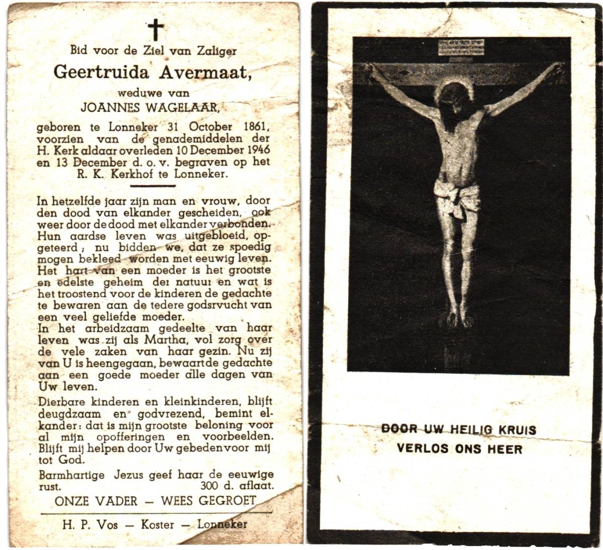 AVERMAAT, Geertruida, geboren op 31-10-1861 te Lonneker, overleden op 10-12-1946 te Lonneker op 85-jarige leeftijd, begraven op 13-12-1946 te Lonneker.